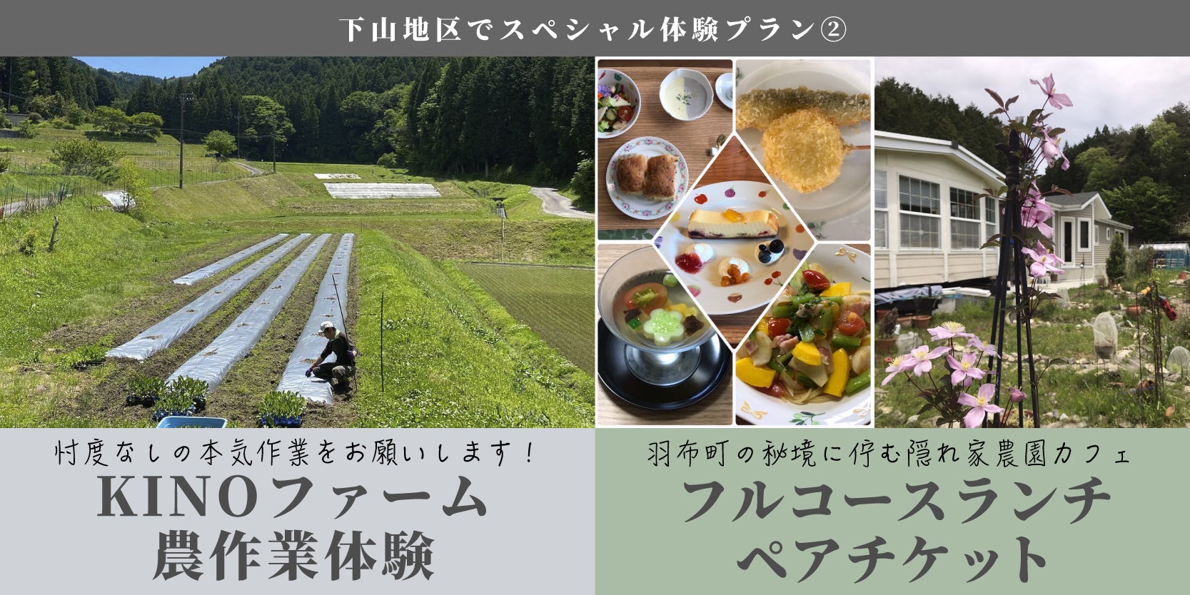 【下山地区でスペシャル体験プラン②】KINOファームでの農業体験と、地元隠れ家農園カフェでペアランチ付き体験コースのセットです。基本的に2名様でのご案内となります。