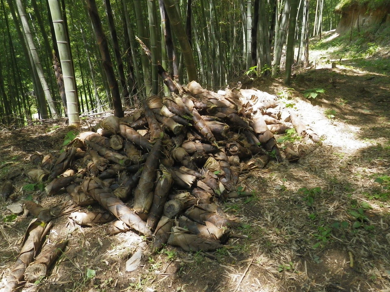 タケノコ畑に放置し、腐るのを待つタケノコ達。我が子を放置するようで辛い気持ちでした。