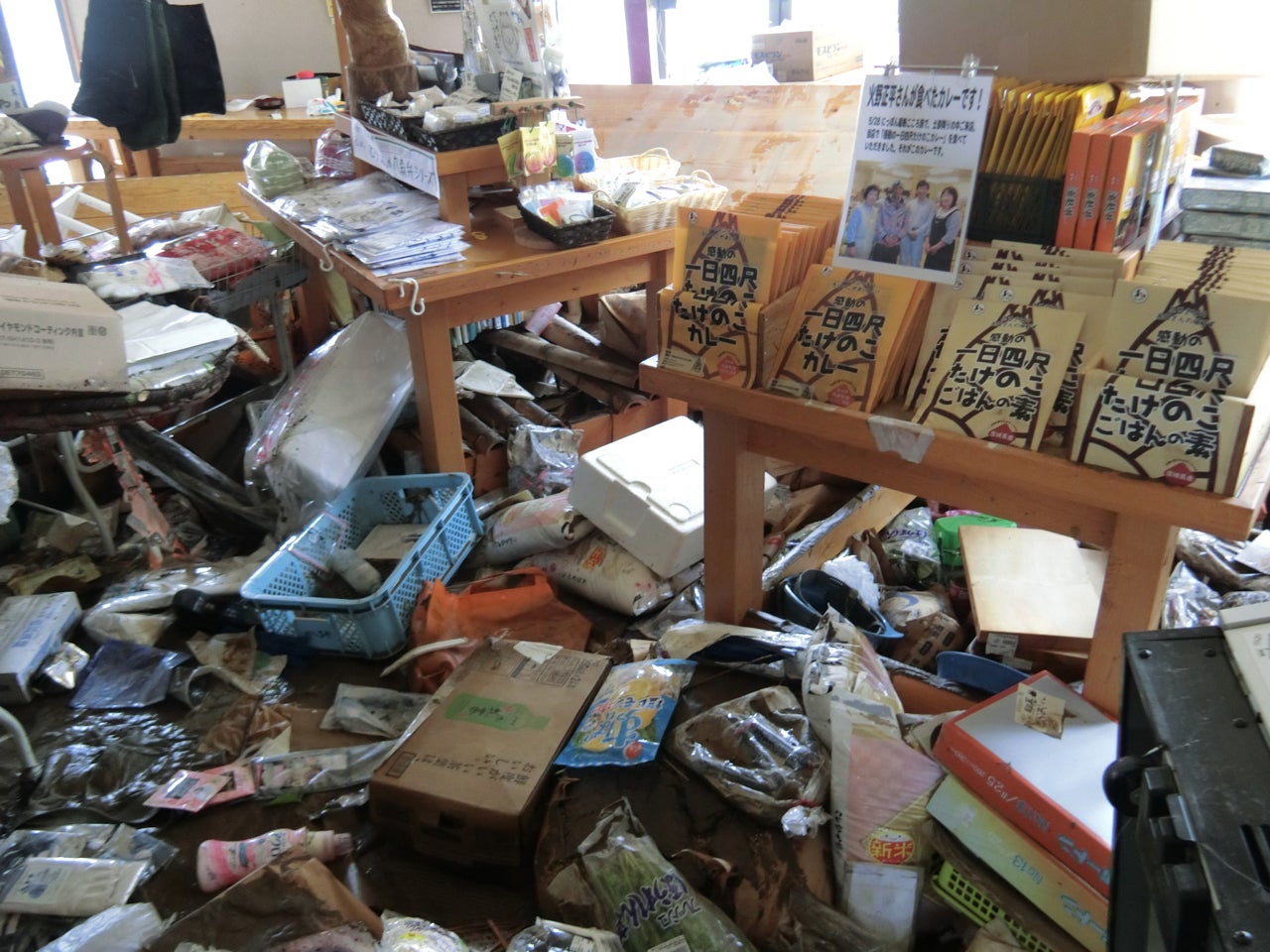 店内1階の商品はほぼ流され、店の什器、厨房用品も泥をかぶり、壊滅的な被害でした。