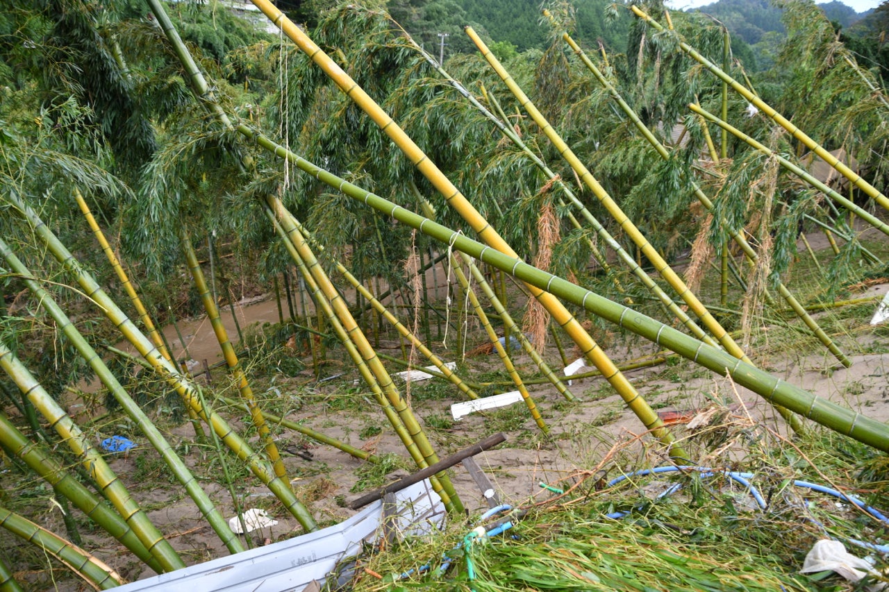 自慢の手入れしたタケノコ畑。川の流れに痛めつけられ、斜めに。再起不能で、涙を飲んで切り倒しました。