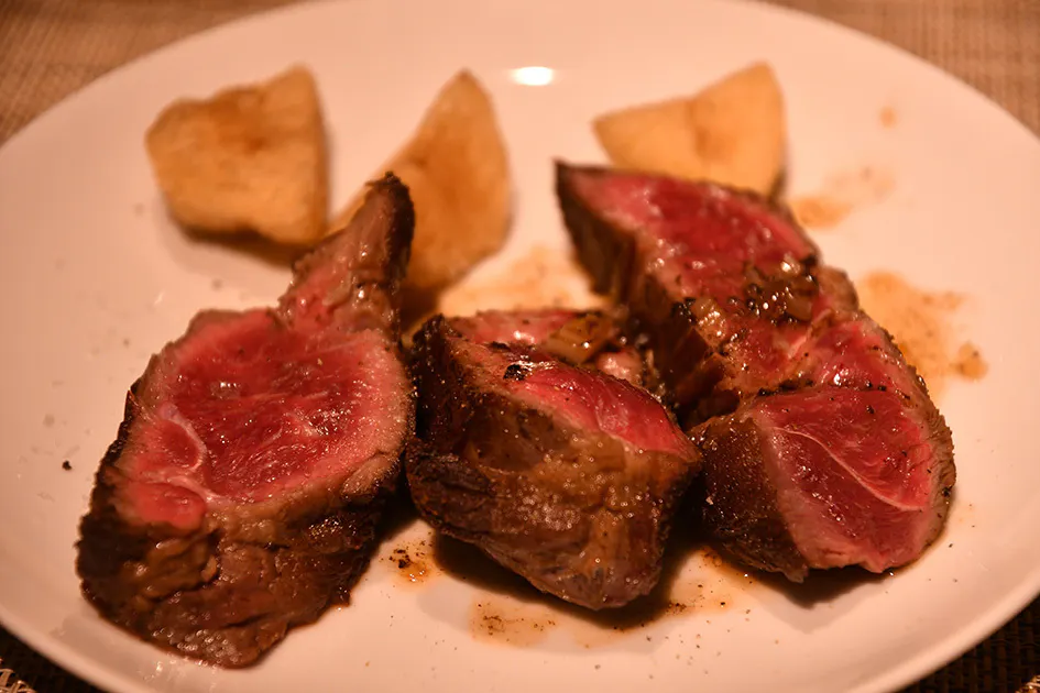 やしまやで育てたタケノコと熟成肉のコンビネーション料理を提供します。お二人分の料金です。