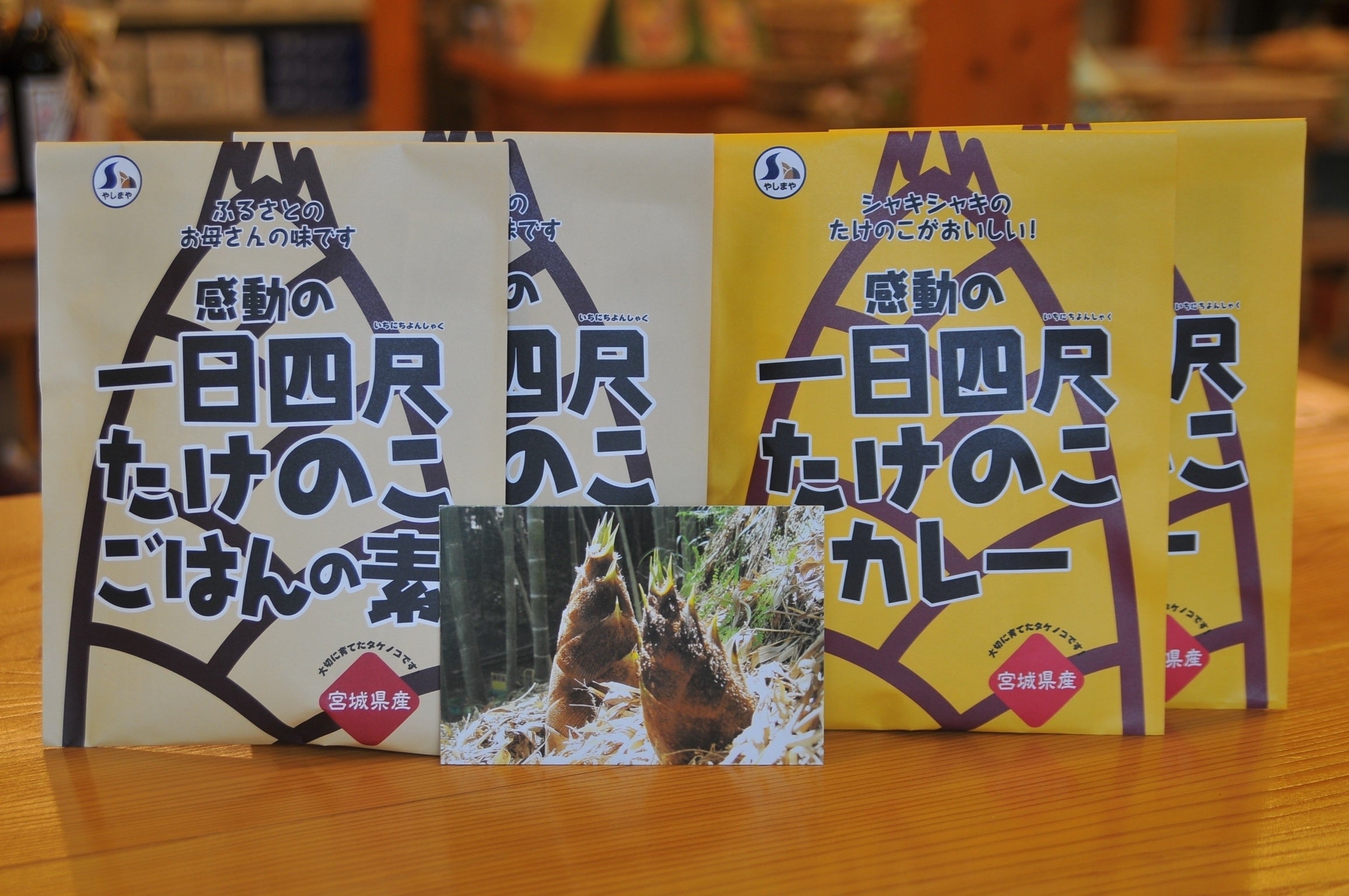書籍に加えて、やしまやのオリジナル商品、感動の一日四尺たけのこカレー(以下たけのこカレー)と感動の一日四尺たけのこごはんの素(以下たけのこごはんの素)にプラスしたのが、「南三陸町YES工房さんのタコロン」。可愛い縁起物です。8色もあり、それぞれご利益がありますよ。