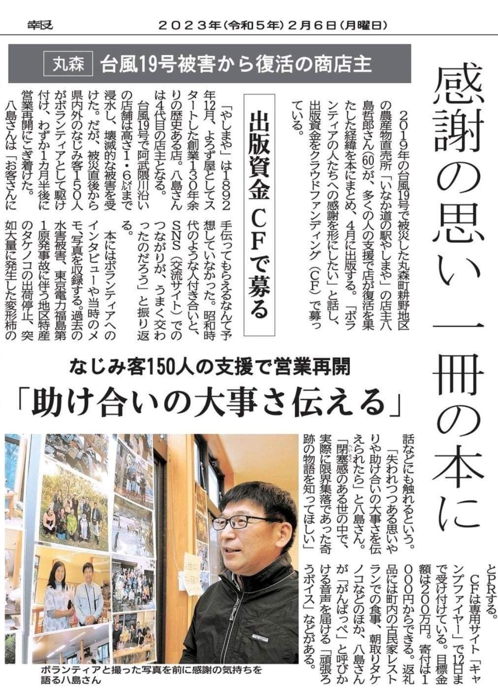 クラファン終了まで残り4日です。皆さんのご支援をいただき、達成率40 %まで来ました。残りの日数でラストスパートです。☆ ☆ ☆ ☆ ☆ ☆ ☆ ☆ ☆ ●新しいリターンを追加しました。書籍に加えて、やしまやのオリジナル商品、感動の一日四尺たけのこカレー(以下たけのこカレー)と感動の一日四尺たけのこごはんの素(以下たけのこごはんの素)にプラスしたのが、「南三陸町YES工房さんのタコロン」。可愛い縁起物です。8色もあり、それぞれご利益がありますよ。詳しく載せます。●1万円 書籍1冊 たけのこカレー、たけのこごはんの素各1個●3万円 書籍3冊 たけのこカレー、たけのこごはんの素各3個●5万円 書籍5冊 たけのこカレー、たけのこごはんの素各5個●10万円 書籍10冊 たけのこカレー、たけのこごはんの素各10個+タコロン3個●20万円 書籍20冊 たけのこカレー、たけのこごはんの素各20個+タコロン8個●30万円 書籍30冊 たけのこカレー、たけのこごはんの素各10個+タコロン8個●10万円以上には縁起物のタコロンを付けます。丸森+南三陸町の魅力を送りますよ!☆ ☆ ☆ ☆ ☆ ☆ ☆ ☆ ☆ 昨日動画でご紹介したオススメリターンに加えました。書籍のみでは物足りない方、美味しいものとグッズとの組み合わせ、いかがでしょうか?