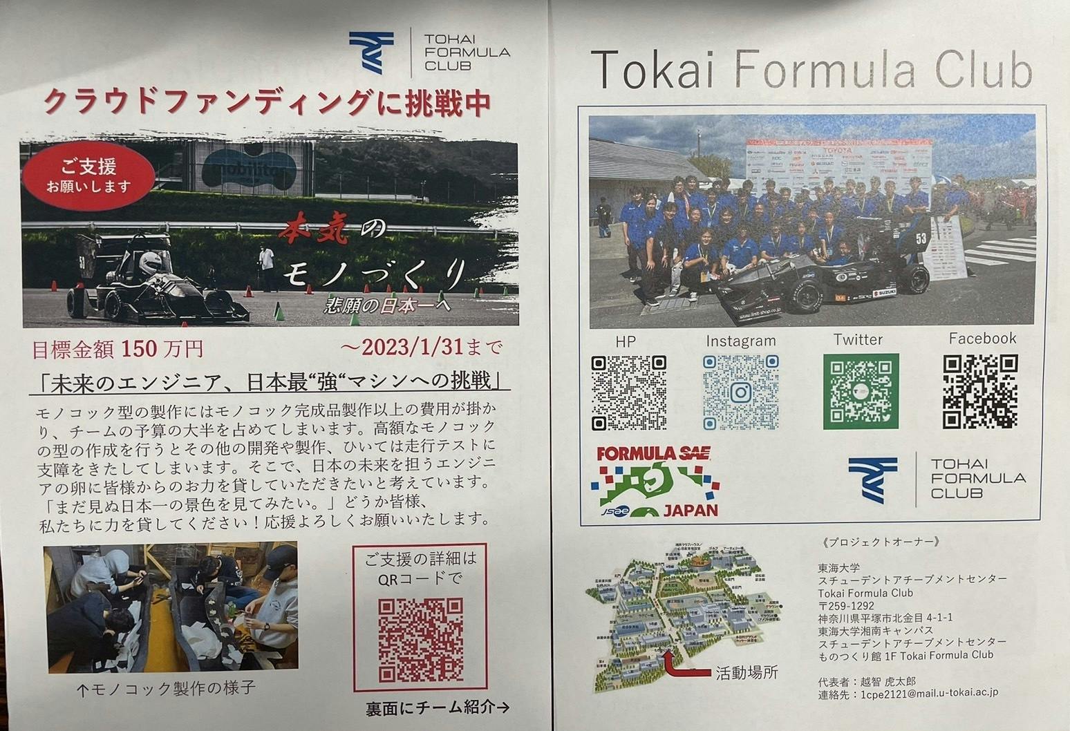 2022/11/21 16:00クラウドファンディングの宣伝用ビラを作成しました。ビラ配りに協力していただける方は下記のメールアドレスに連絡お願いします。Email:tokai.formula@gmail.com もっと見る