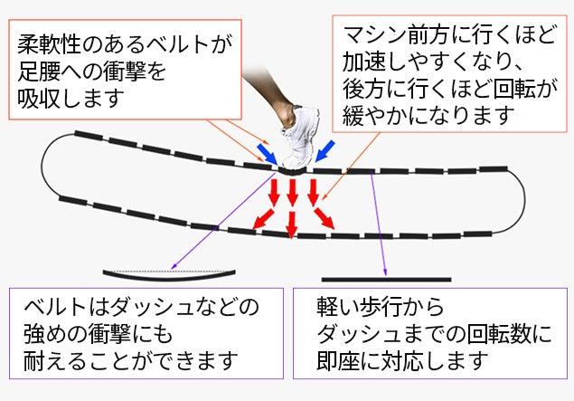 接地面のベルトは、着地衝撃を和らげるクッション性を考慮した設計に。