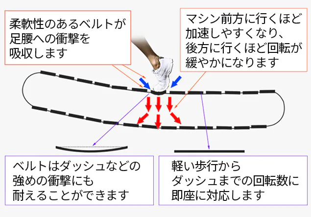 しっかり吸収しつつも、屋外を走る時の自然な感覚により近い運動が可能です。
