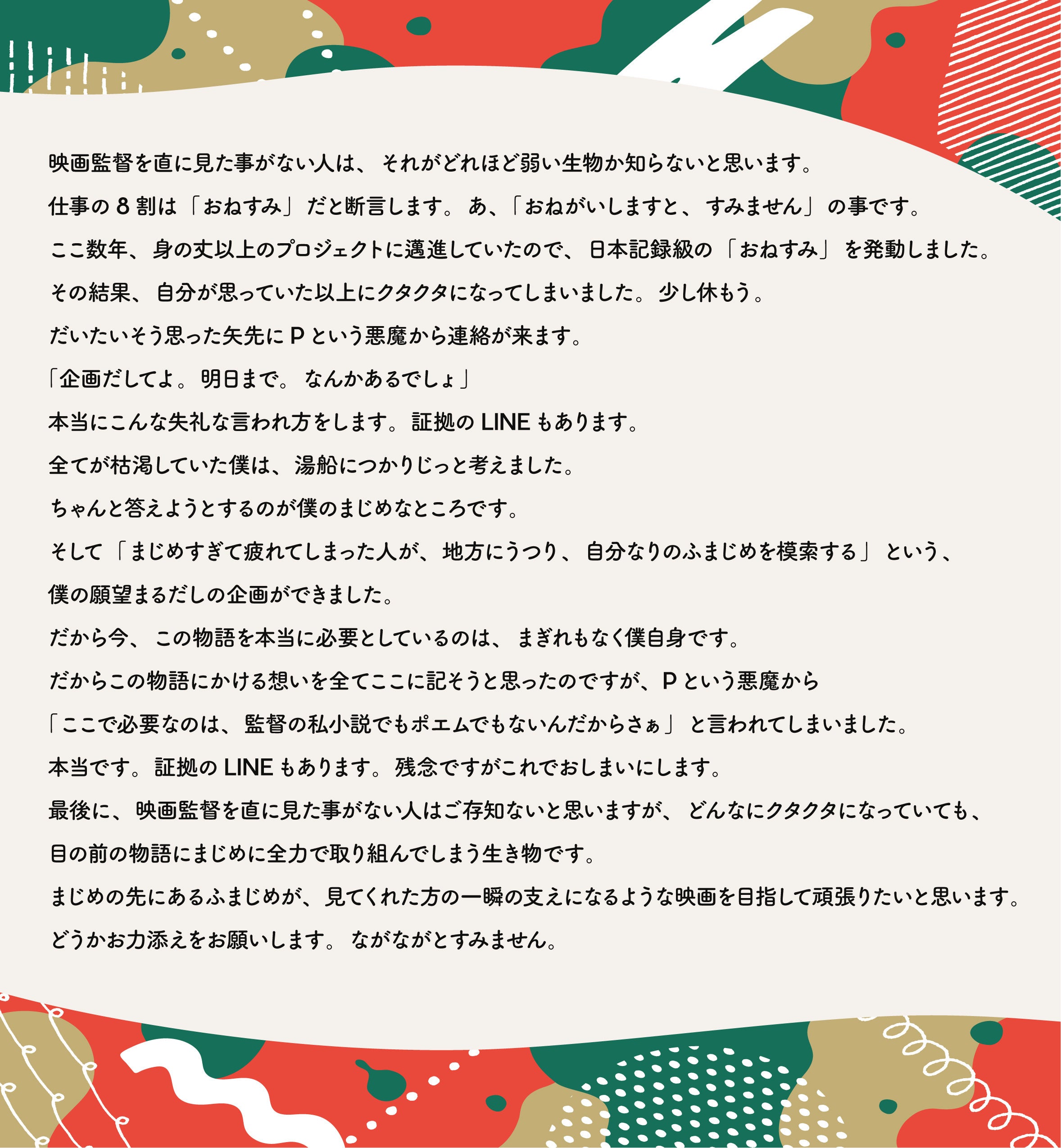 2023/01/31 20:00クラウドファンディングも残すところあと数時間。映画『ふまじめ通信』はどんなスタッフによってつくられたのか。クニちゃんの手書きチェキでご紹介いたします^^▲撮影・ビジュアルディレクター:柴崎まどか▲機材コーディネート・照明:春木康輔(ユイカミレイ)▲撮影助手:中村碧▲録音:庄野廉太朗▲ヘアメイク:中居詩野(IBW美容学校のみなさま)▲ヘアメイク:佐藤あずさ▲スタイリスト:7A▲音楽:Kiss the gambler▲制作進行:加藤弘晃▲製作プロデューサー:前田和紀 &企画プロデューサー:谷内田彰久▲宿泊所&美味しい食事:釣り人宿「菊水」オーナー伊藤さんこの中の誰か一人でも欠けていたら、『ふまじめ通信』の撮影は無事にできなかった思います。この他にも応援で来てくれた方、ポスプロで関わってくださる方、そしてクラウドファンディングで応援してくださる皆さまのご協力があって、映画はやっと完成できるのだと痛感しております。どんなにちいさな映画でも、たったひとりではつくれない。映画は人と人が手を取り合ってつくるものなんだと、この現場を通して改めて学び直しました。いい映画になると思います。ぜひ見届けていただけたら幸いです。 もっと見る