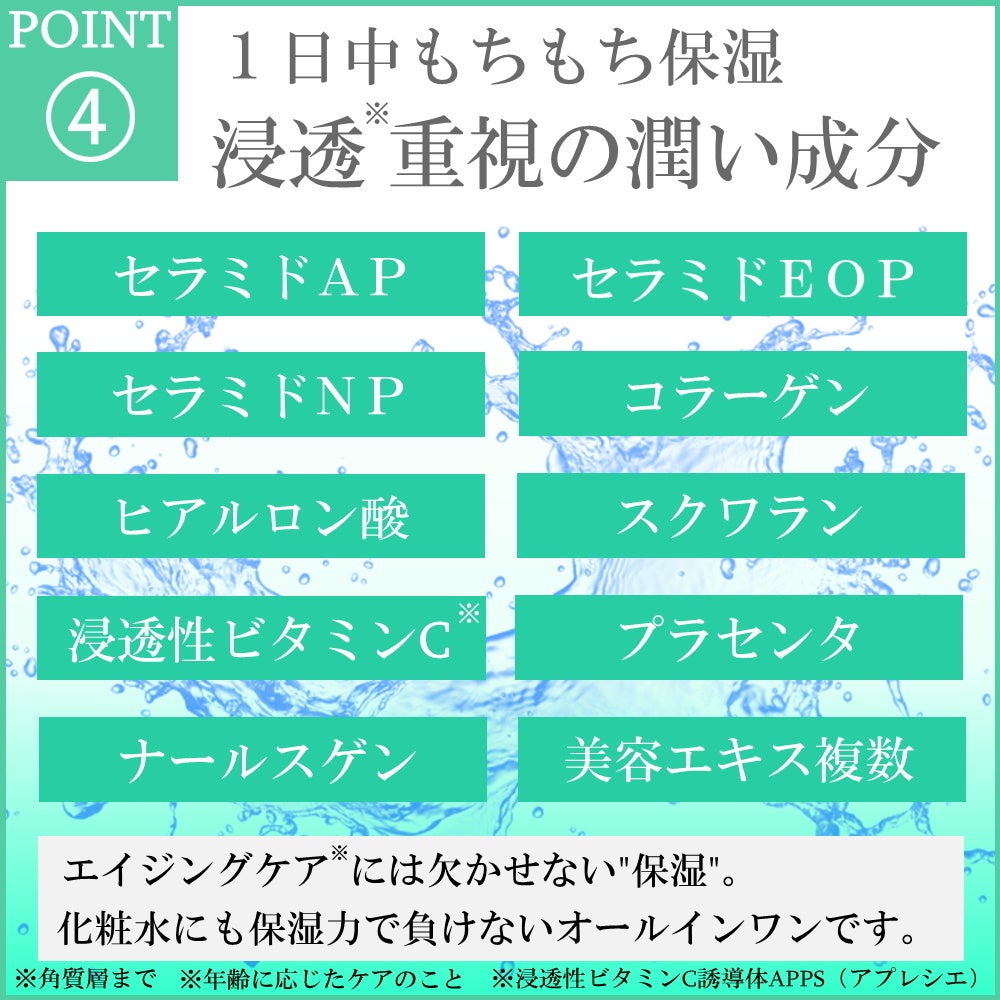 水、グリセリン、ナイアシンアミド、水添ファルネセン、ペンチレングリコール、アセチルヒアルロン酸Na、ヒアルロン酸Na、ヒアルロン酸クロスポリマー-2-Na、加水分解ヒアルロン酸Na、パルミチン酸アスコルビルリン酸3Na、ヒト遺伝子組換オリゴペプチド-1、フラーレン、セラミドAP、セラミドEOP、セラミドNP、プラセンタエキス、アセチルヘキサペプチド-8、アルブチン、カルノシン、カルボキシメチルフェニルアミノカルボキシプロピルホスホン酸メチル、レスベラトロール、クダモノトケイソウ果実エキス、フィトスフィンゴシン、フェニルエチルレゾルシノール、ブドウ葉/種子/皮エキス、加水分解コラーゲン、水溶性プロテオグリカン、シクロデキストリン、スクワラン、トレハロース、マルトース、ラウロイルラクチレートNa、PPG-6デシルテトラデセス-30、カルボマー、キサンタンガム、コレステロール、ジマルトシルシクロデキストリン、マルトシルシクロデキストリン、水酸化K、BG、PVP、シリカ、エチルヘキシルグリセリン、フェノキシエタノール、香料