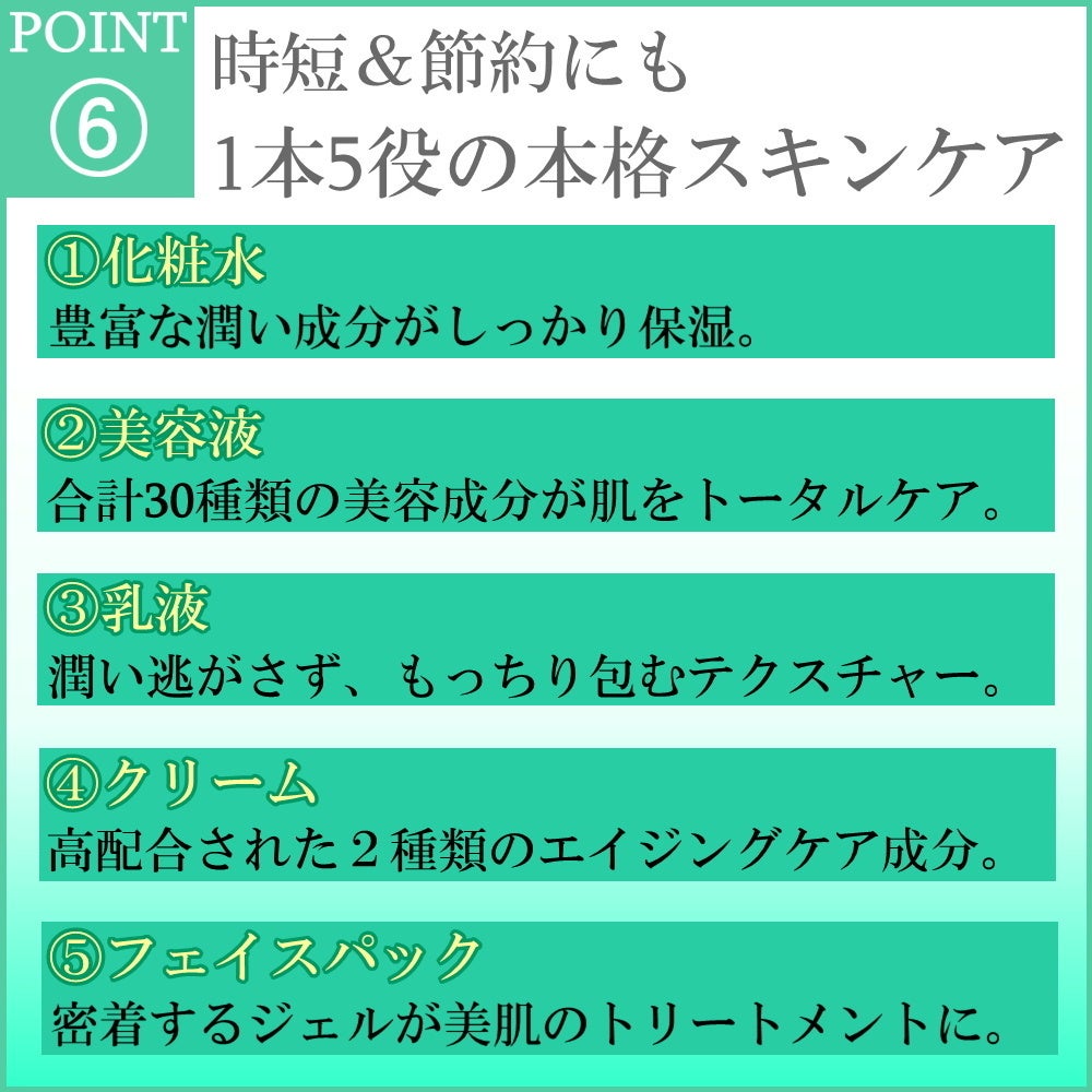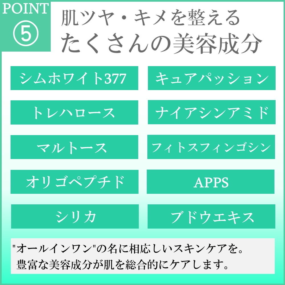 『1本5役の本格エイジングケア』をテーマに開発したオールインワンとなっております。