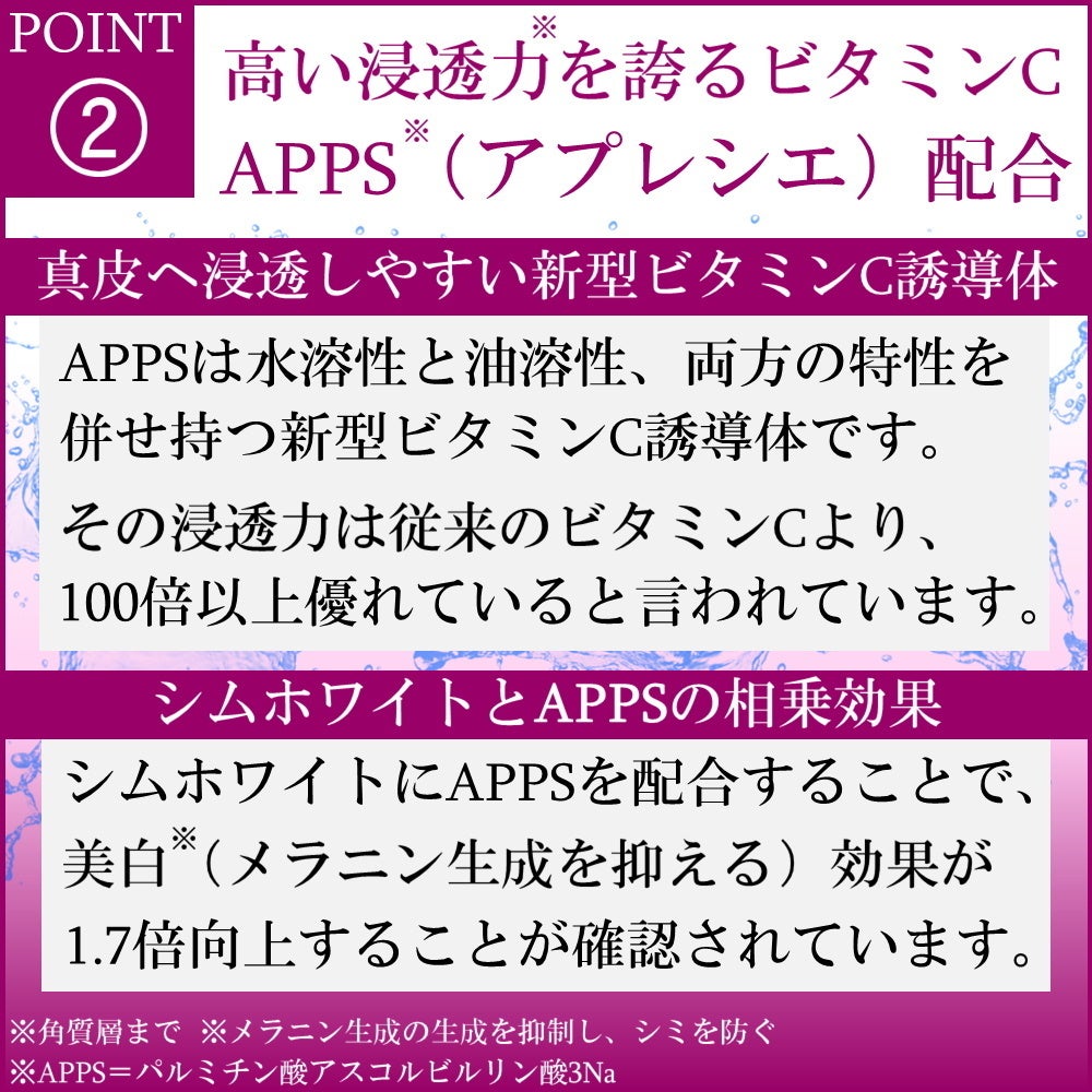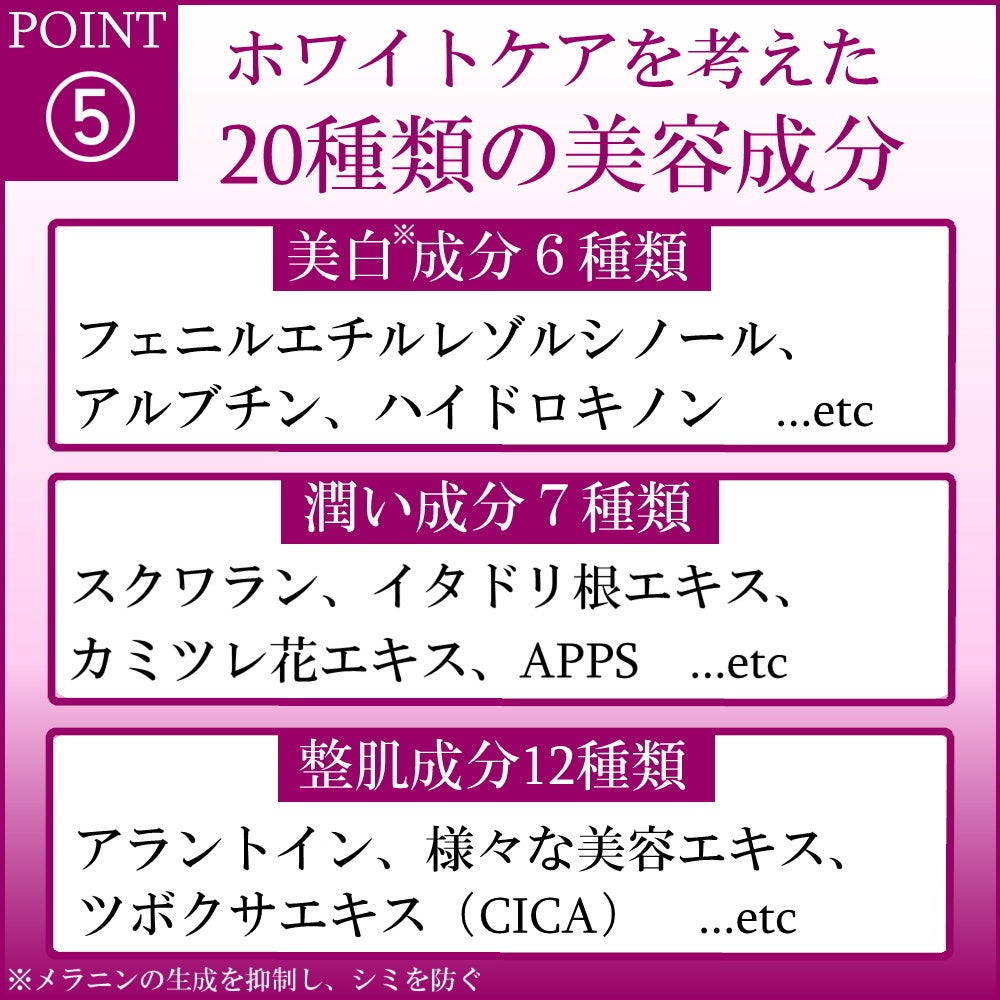 ※美白=シミの原因となるメラニンを生成する酵素チロシナーゼの働きを抑えることでシミやそばかすを改善する効果。