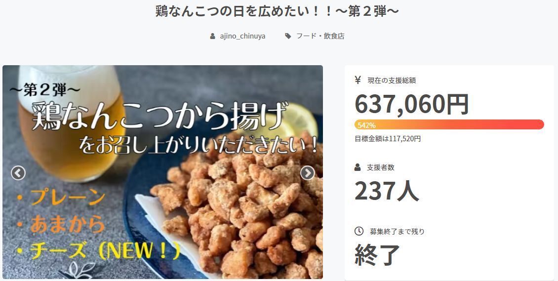 今回当社新商品として全国発売するチーズ味のなんこつから揚げをCAMPFIREを通してみなさまにお召し上がりいただきたくこの度クラウドファンディングに参加いたしました!