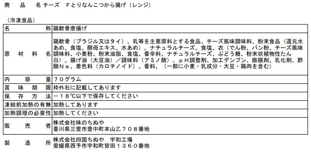【レンジで簡単!鶏なんこつ唐揚げ(甘辛味)】・名称:タレ付き鶏軟骨唐揚げ・原材料名:鶏軟骨(タイ)、衣(でん粉、パン粉、小麦粉、食塩、ぶどう糖、香辛料、粉末状植物性たん白、植物油 脂)、たれ(糖類(ぶどう糖果糖液糖、砂糖(三温糖、加工黒糖))、しょうゆ、米醗酵調味料、醸造酢、食 塩、香辛料、しょうゆ加工品、酵母エキス、味噌加工品)、揚げ油(大豆油)/加工デンプン、調味料(アミ ノ酸)、着色料(カラメル、パプリカ色素)、膨脹剤、増粘多糖類、セルロース、甘味料(スクラロース)、 (一部に小麦・大豆・鶏肉を含む)・内容量:90グラム・保存方法:-18℃以下で保存してください。