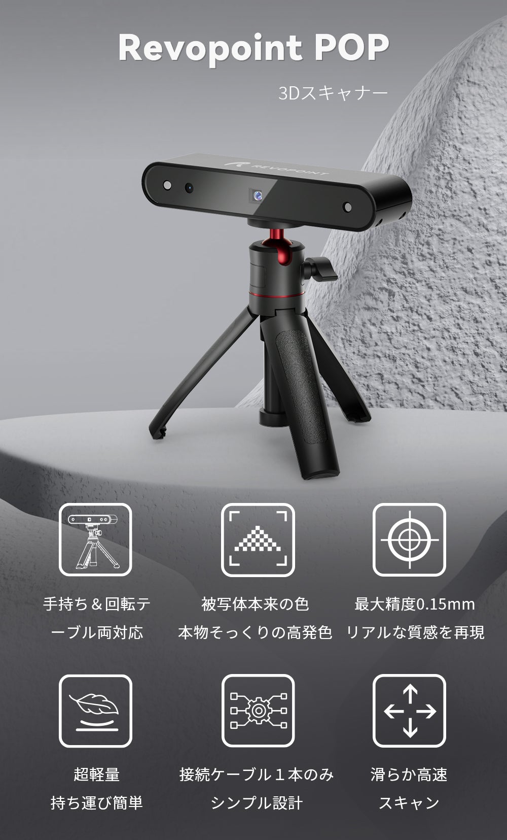 Revopoint社の研究開発の目標は、3Dモデリングの工程を高精度かつシンプルにすることにより、より多くのクリエイターが複雑な操作から解放され、集中して本来のクリエイティブ活動を行うことが出来ることを目指しております。この目標を掲げ、私達は2019年に家庭用小型3Dスキャナーの第1世代「POP」を開発しました。
