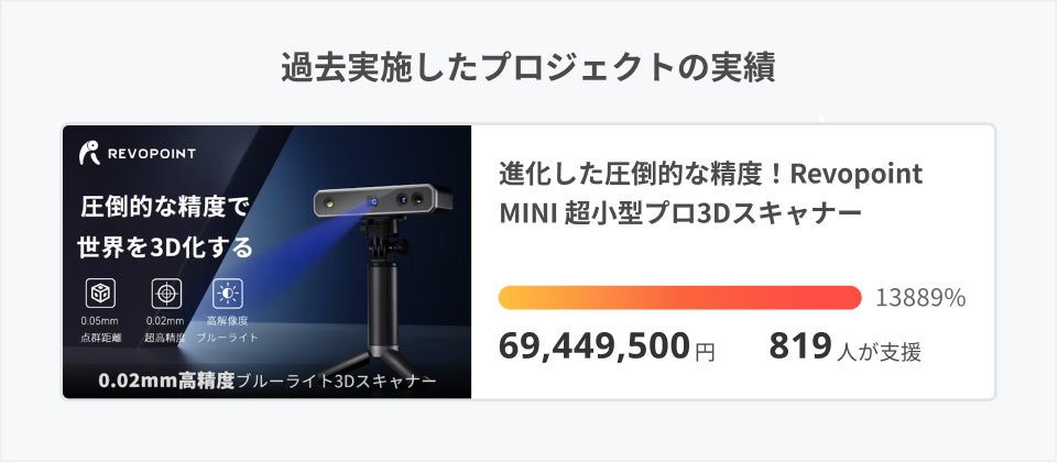 2025/08/18 18:44Revopoint をご支援いただいている皆さまへこのたびは「Trackit 光学トラッキング式3Dスキャナー」クラウドファンディングに多大なるご関心とご支援を賜り、誠にありがとうございました。皆さまのお力添えにより、本プロジェクトは総額 25,971,070円 を達成し、無事に終了することができました。現在、確定いただいたご注文につきましては、順次情報を確認し、できるだけ早く発送準備を進めてまいります。皆さまに一日も早く、Trackit がもたらす高効率かつ高精度な体験をお届けできれば幸いです。また、Trackit はすでに 日本公式オンラインストア にて販売を開始しております。クラファン期間中の購入を逃された方も、ぜひこの機会にご検討ください。Revopoint公式サイトお問い合わせご不明な点がございましたら、下記までお気軽にご連絡ください。customer@revopoint3d.com今後ともRevopointをどうぞよろしくお願い申し上げます。Revopointチーム もっと見る