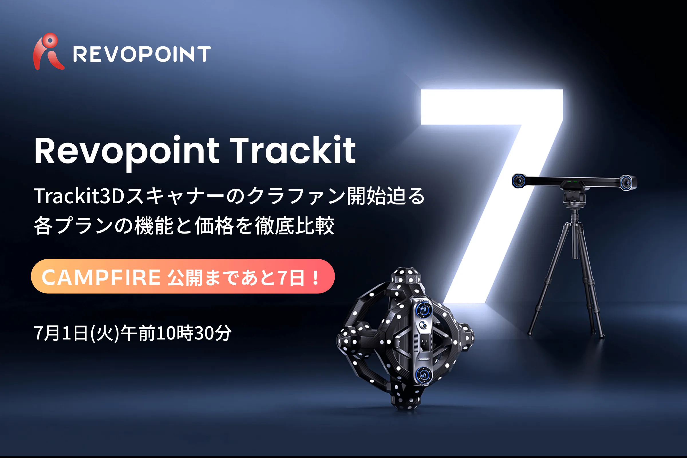Revopointフォロワーの皆さまへRevopointをご愛顧いただき、誠にありがとうございます。このたび、Revopointのマーカーレス光学トラキング式3Dスキャナー「Trackit」が、CAMPFIREでのクラウドファンディング開始まであと7日となりました!製品の詳細な性能や活用シーンを事前にご確認いただけるよう、プロジェクトページを先行公開しております。以下のリンクから詳細をチェックし、プロジェクトをフォローください。開始をいち早くお知らせし、最大40%OFFの特別価格でお求めいただけます。> 製品詳細ページはこちら3つのプランをわかりやすくご紹介!個人スタジオから大規模工場まで、ニーズに合わせてお選びいただけます。価格:3プラン中最安値、超早割特典で最大40%OFF梱包内容:Trackit本体+基本付属品主な用途:文化財のデジタル化、考古学、3Dアセット制作、教育用途、バーチャル展示開発など、高精度・非接触・マーカー不要・高速モデリングを求める方に最適なセットです。価格:中間価格帯。超早割特典で最大40%OFF梱包内容:Trackitスタンダードセット+Revo Design(1年ライセンス)主な用途:自動車改造設計、機械製造、リバースエンジニアリング、プロトタイピング、パーツ製造など、スキャンからCADへの変換や測定・加工データの活用を重視する方におすすめの構成です。価格:3セット中で最高価格だが、最大45%OFFの超早割が適用される最もお得なセット梱包内容:Trackitスタンダードセット+ロボットアーム+大型ターンテーブル主な用途:工場ラインでの自動検査、大量3Dスキャン、繰り返し測定が必要な現場などに最適な、高精度かつ安定した自動化ソリューションを求める方向けの最上位セットです。東京体験会開催決定!2025年7月第1週末に東京で「Trackit」体験会を開催予定です。製品性能や操作性を実際に体感できる貴重な機会となります。ご興味のある方は、以下のフォームから約1分でお申し込みください。詳細確定後、SNSまたはメールでご案内いたします。製品詳細は引き続き以下のリンクからご確認いただけます。プロジェクト開始を逃さないよう、ぜひフォローをお願いいたします。> 製品詳細ページはこちらRevopointチーム