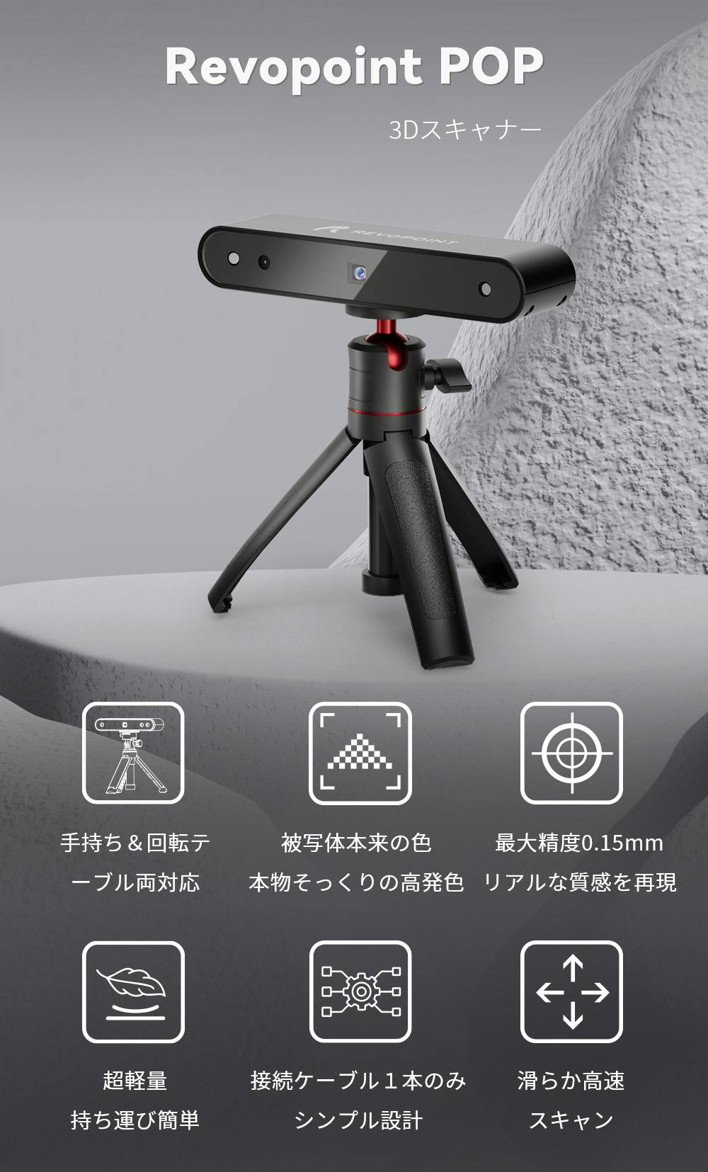 3D業界に革命をもたらしたREVOPOINT初代小型3Dスキャナー。プロ仕様の高精度3Dスキャナーを初めて日常的な家電製品と同等の価格でご提供!POPを使えば3Dプリント、VR/ARモデル製作、リバースデザインに相応しい3Dモデリングが誰でも簡単に生成できます!