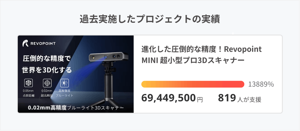 • Revopoint をご支援いただいている皆さまへこのたびは「Trackit 光学トラッキング式3Dスキャナー」クラウドファンディングに多大なるご関心とご支援を賜り、誠にありがとうございました。皆さまのお力添えにより、本プロジェクトは総額 25,971,070円 を達成し、無事に終了することができました。現在、確定いただいたご注文につきましては、順次情報を確認し、できるだけ早く発送準備を進めてまいります。皆さまに一日も早く、Trackit がもたらす高効率かつ高精度な体験をお届けできれば幸いです。また、Trackit はすでに 日本公式オンラインストア にて販売を開始しております。クラファン期間中の購入を逃された方も、ぜひこの機会にご検討ください。Revopoint公式サイトお問い合わせご不明な点がございましたら、下記までお気軽にご連絡ください。customer@revopoint3d.com今後ともRevopointをどうぞよろしくお願い申し上げます。Revopointチーム もっと見る