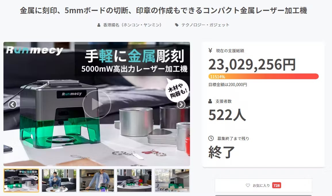 支援額23,029,256円を突破したコンパクト金属レーザー加工機「Runmecy」が更にグレードアップして登場!
