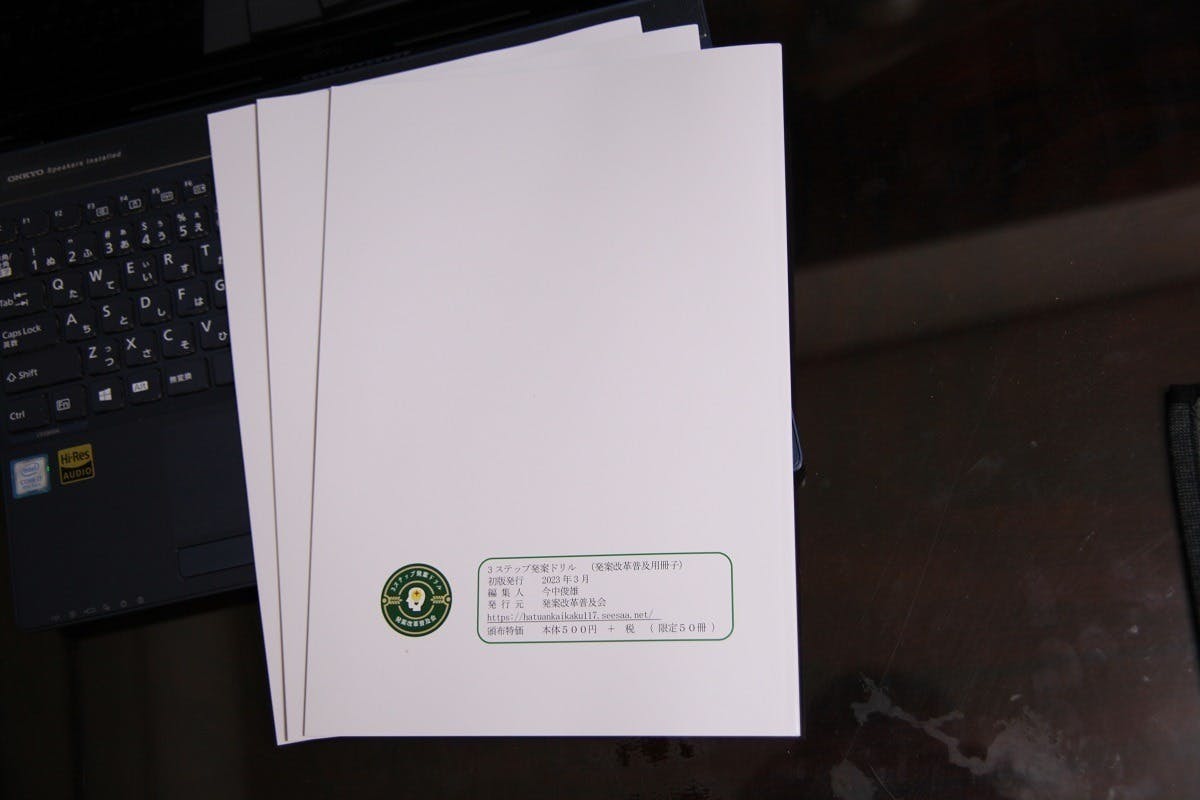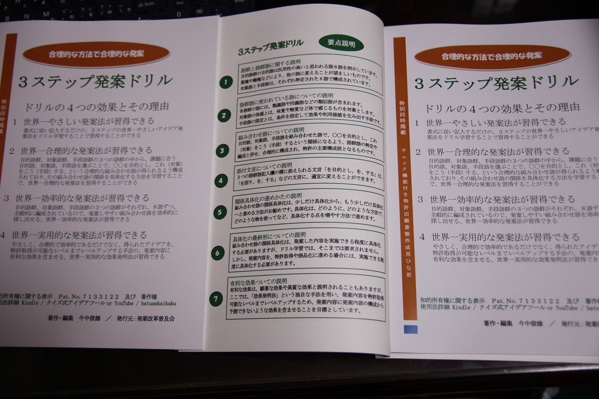 具体的には、特許を取得したツールを発展させた「3ステップ発案ドリル」という冊子を用い、ドリル形式の学習で習得できるよう、3ステップという簡便さと、3ステップというシステム化された方式を用いて普及を図ってまいりたいと考えております。