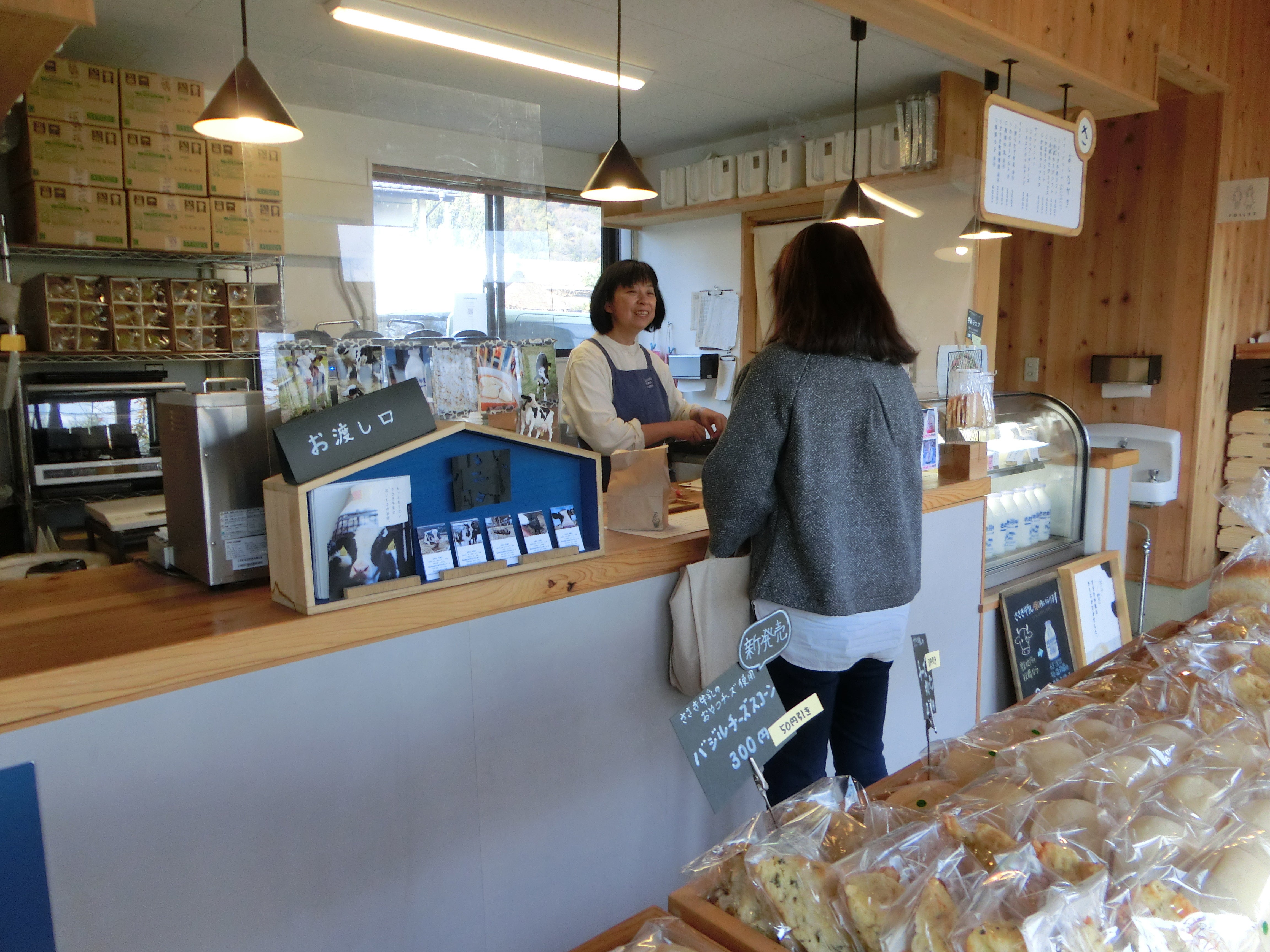 ささき牛乳や、ささき牛乳を使ったソフトクリーム・チーズ・パンなどを販売している私の仕事場です。カフェのすぐ横には牛の運動場があり、牛たちがのんびりとした時間をすごしています。