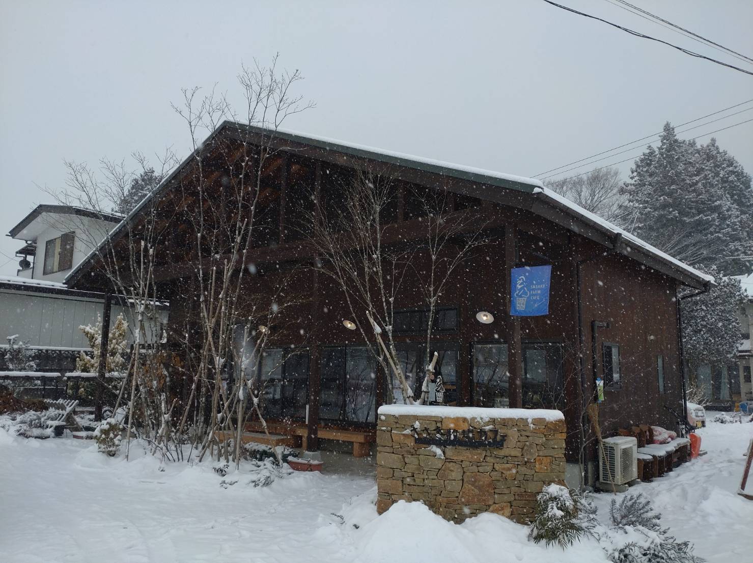 午前中から雪が降り始めた福島市佐原地区。カフェの周りは雪景色、牛の運動場も真っ白です。