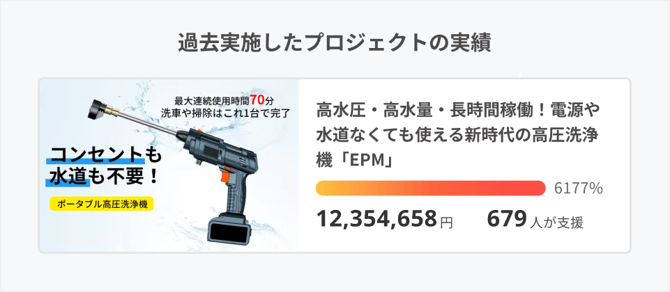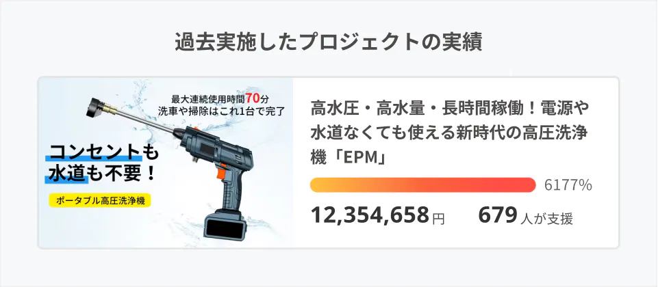 2022/11/18 18:30皆様こんにちは! Y&Y STOREでございます。いつも弊社をご愛顧いただき、誠にありがとうございます。第1弾や第2弾にて好評をいただきありがとうございました! 弊社は本日より、第3弾の高圧洗浄機「EPM」のクラウドファンディングを開始いたしました。プロジェクトページをご覧いただき、誠にありがとうございます。高圧洗浄機「EPM」のメリット・コンセントや水道不要!使用場所の制限がない・手で洗うよりキレイ!時短ができる!・手が届かない高い場所&狭い場所まで洗浄・可変ノズルで使い方を自由にアレンジ・軽量なので女性やお年寄りでも簡単に使える・雨水や残り湯を活用、水道代も節約できる前回買い逃してしまったという方も、是非この機会をご利用ください! また、製品について何かご質問などあれば、いつでも遠慮なくお問い合わせください。引き続き、プロジェクトを暖かく見守ってくださると幸いです。どうぞ宜しくお願い申し上げます。 もっと見る