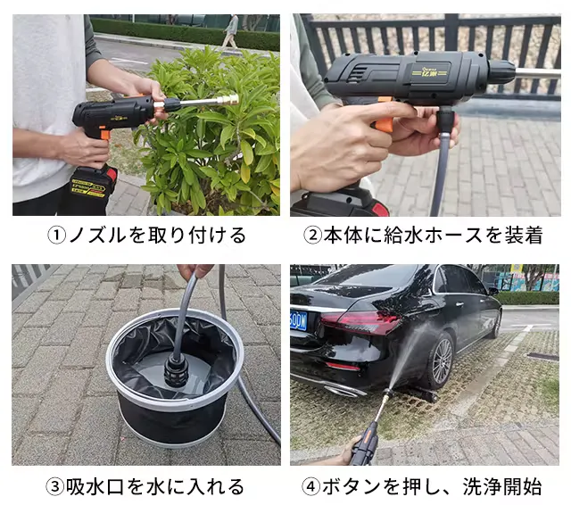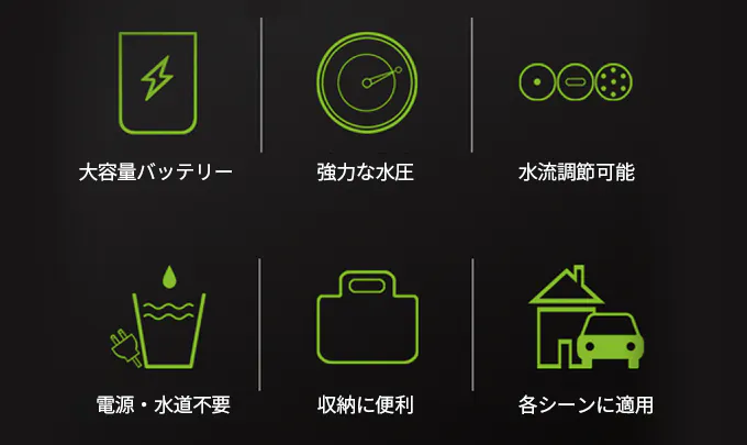 軽量&コンパクトの設計で持ち運びが便利。車やバイクの洗車から、コンクリートや家の外壁の汚れ、お庭やベランダなどあらゆる場所を水の衝撃力で洗い落とします。また、工具や農具の泥落としや、キャンプや釣り用品の洗浄など仕事から趣味にまで幅広く使用できます。