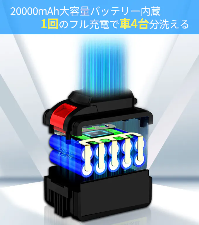 取り外し可能な20000mAh超大容量バッテリーを搭載。フル充電で最大70分まで連続稼働可能で、広い範囲の洗浄に最適!