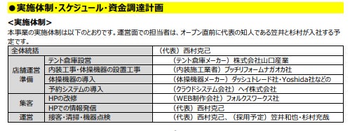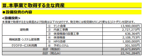 事業計画書の該当する箇所の画像を掲載させていただきます。しかし近年の基礎工事等の高騰により、テント倉庫建設費や内装工事費が記載金額よりも大幅に上がってしまっているため、そちらにいただいた資金を使わせていただきます。(※CAMPFIRE手数料にも使用させていただきます。)