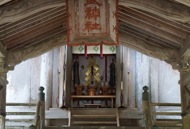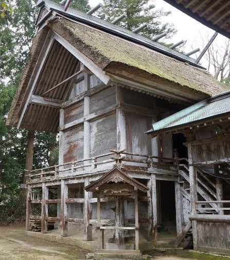 社殿は本殿、拝殿、中殿で構成されており、本殿は茅葺の神明造、拝殿は権現造となっています。