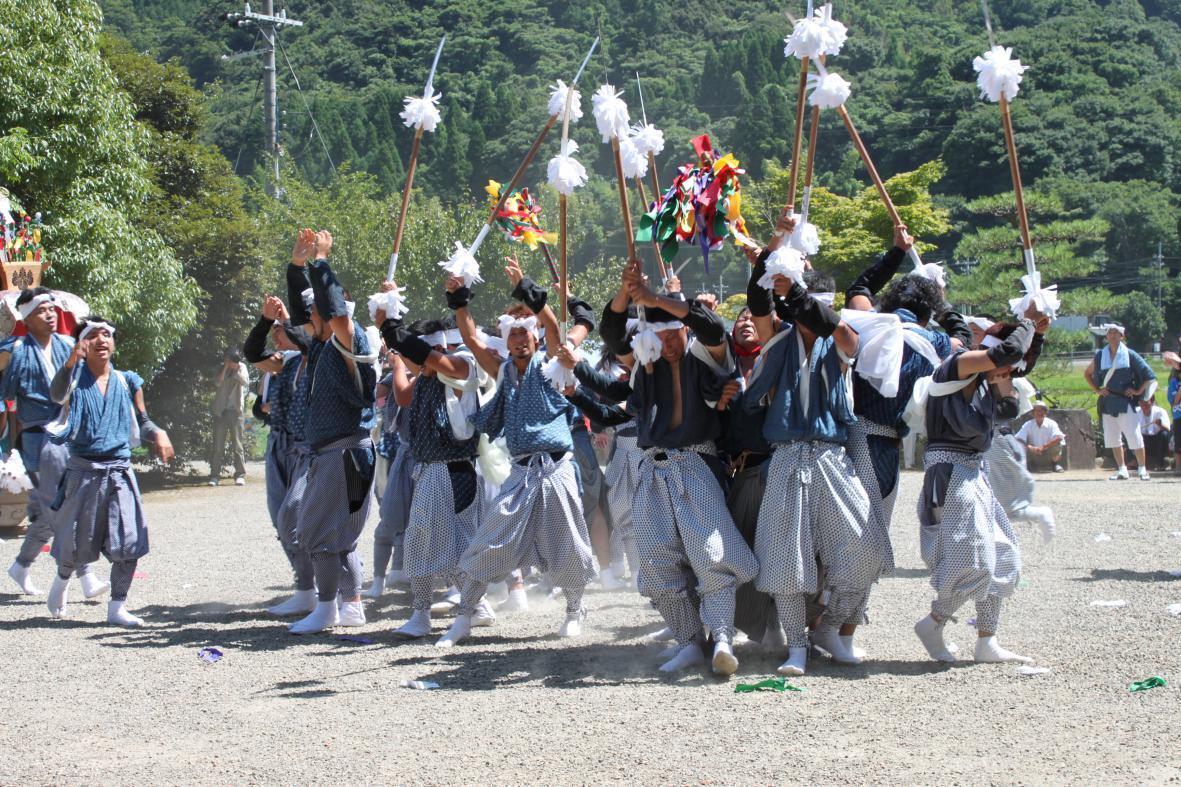 祭り当日は、各区から太鼓台を曳いて宮入し、神事が終わると、くじで決めた順に祭礼 (棒振り・小太刀・大太刀・花踊り)が奉納されます。