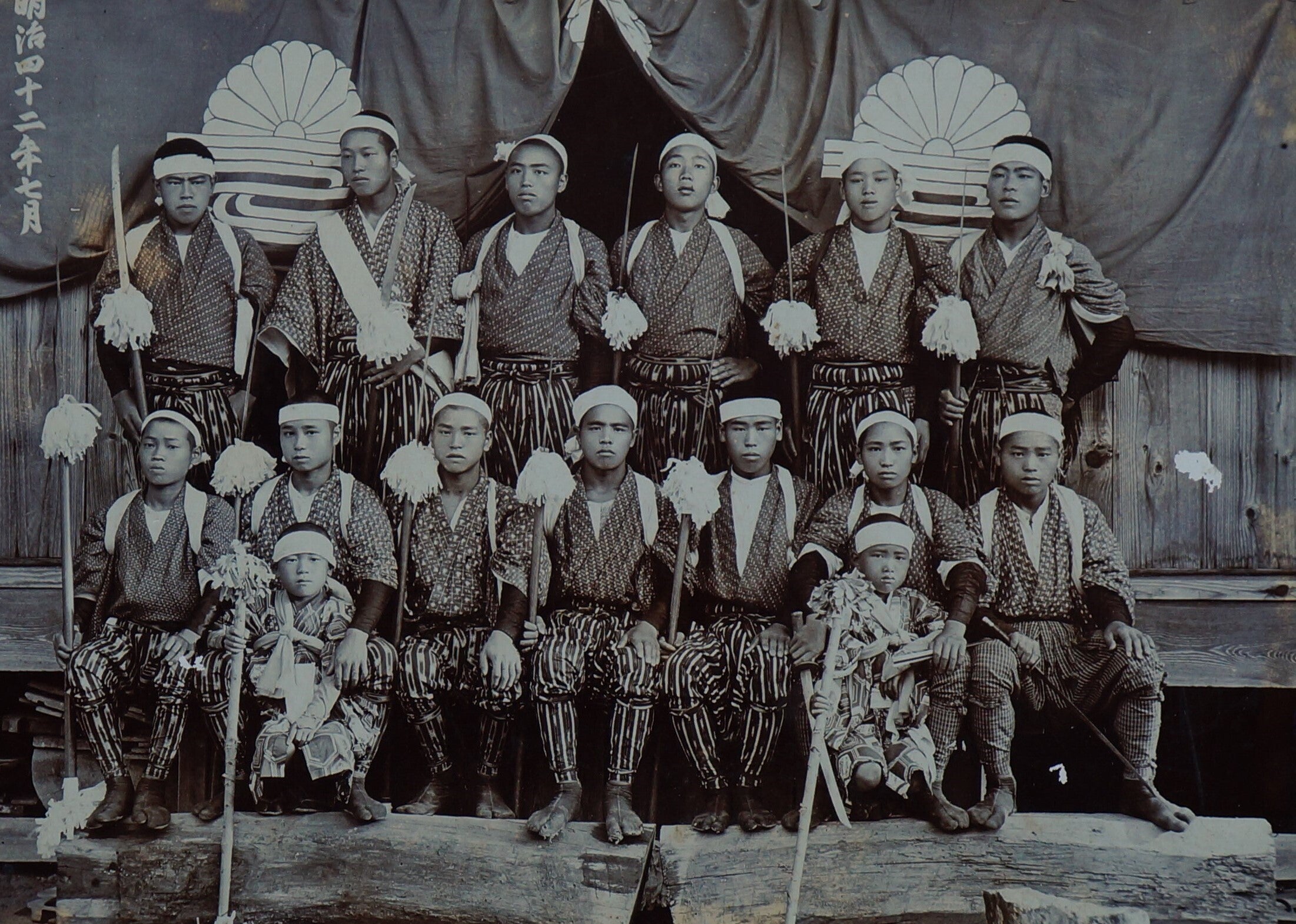 この集合写真は、昭和16年(1941)8月8日、本庄上区例祭での太刀振り奉納記念写真(於:野尻三柱神社)で、同年の12月8日、太平洋戦争が勃発した。