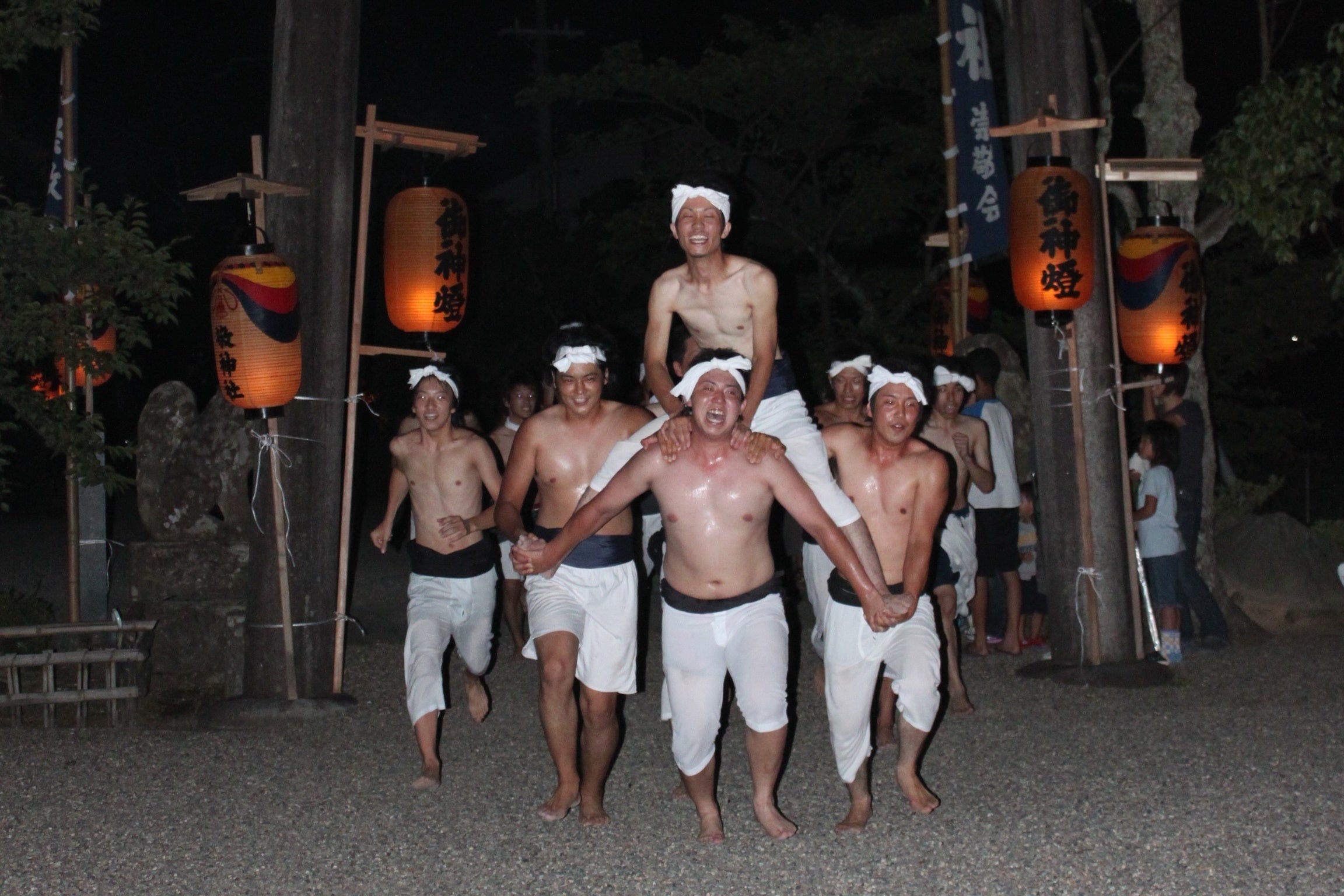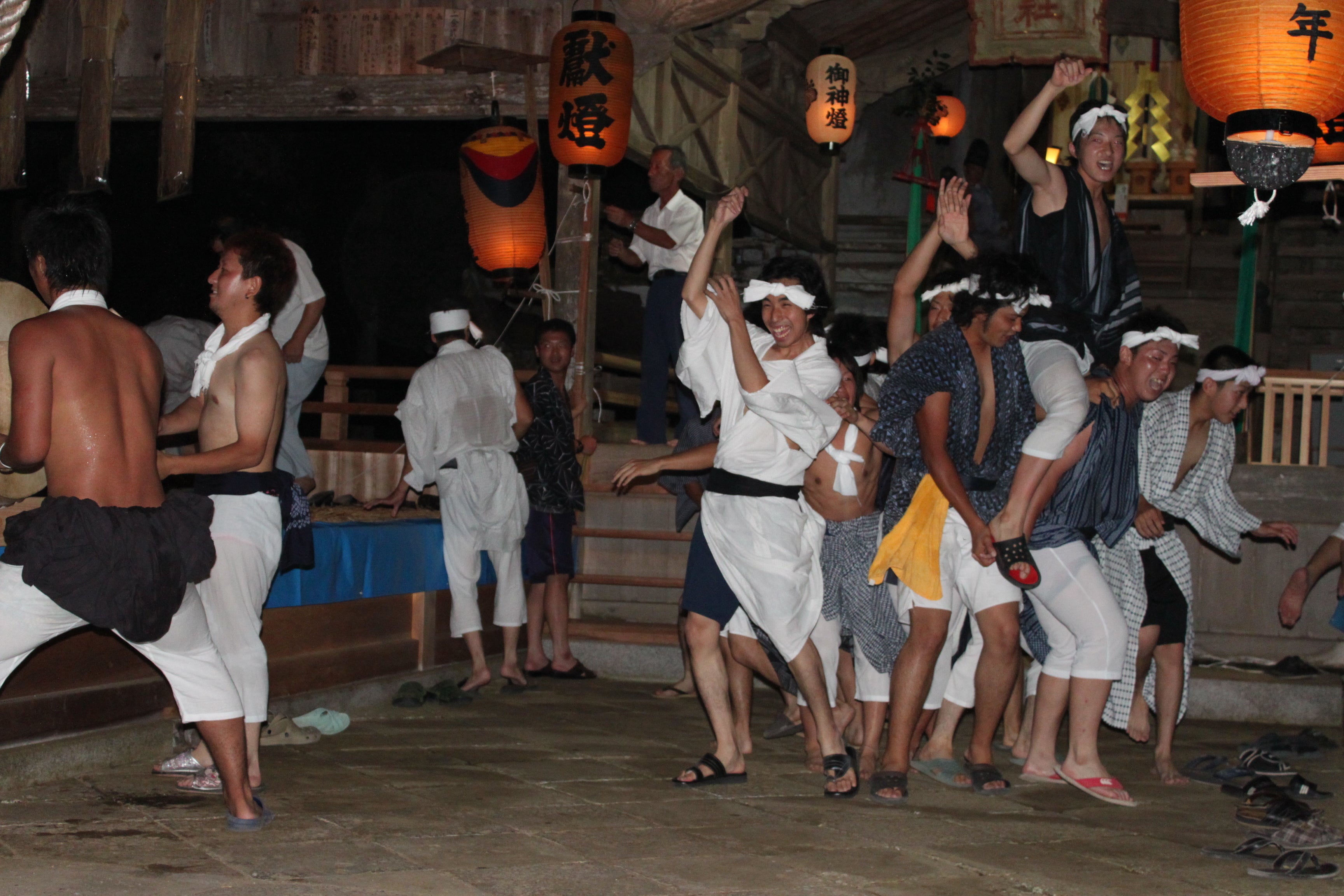前日の宵宮には、各地区から手丸提灯を先頭にして、高張提灯等の順に並んで伊勢音頭を歌いながら浦嶋神社に向かいます。神社の参道にかかると大声でかけ声をかけながら一気に拝殿に駆け込み、この後、各地区の若者が裸になり一団となって激しくもみ合う。