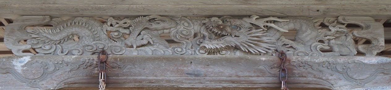 拝殿正面の彫刻には、龍をはじめとする動植物の彫り物が施されていますが、これは江戸時代に活躍した丹波国(兵庫県柏原市)の中井権次による作です。