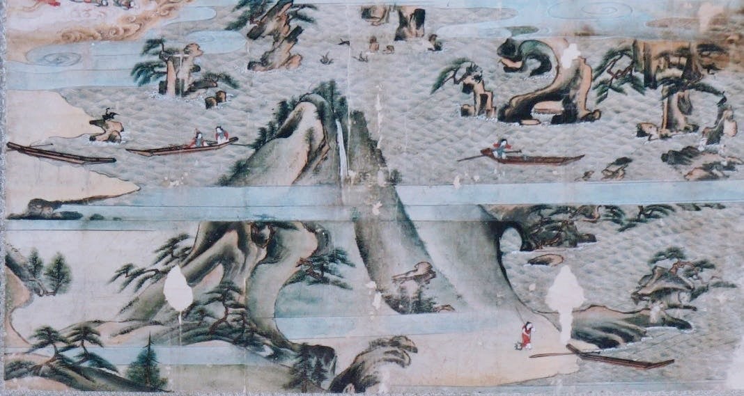室町時代のもので、この縁起は、浦嶋太郎の住んでいた水乃江里から浦嶋太郎が蓬莱山の国に至る迄と帰って来てからの出来事等を細かく古い書物をもとに書かれた日本最古と云われる浦嶋を物語る絵巻の一部です。