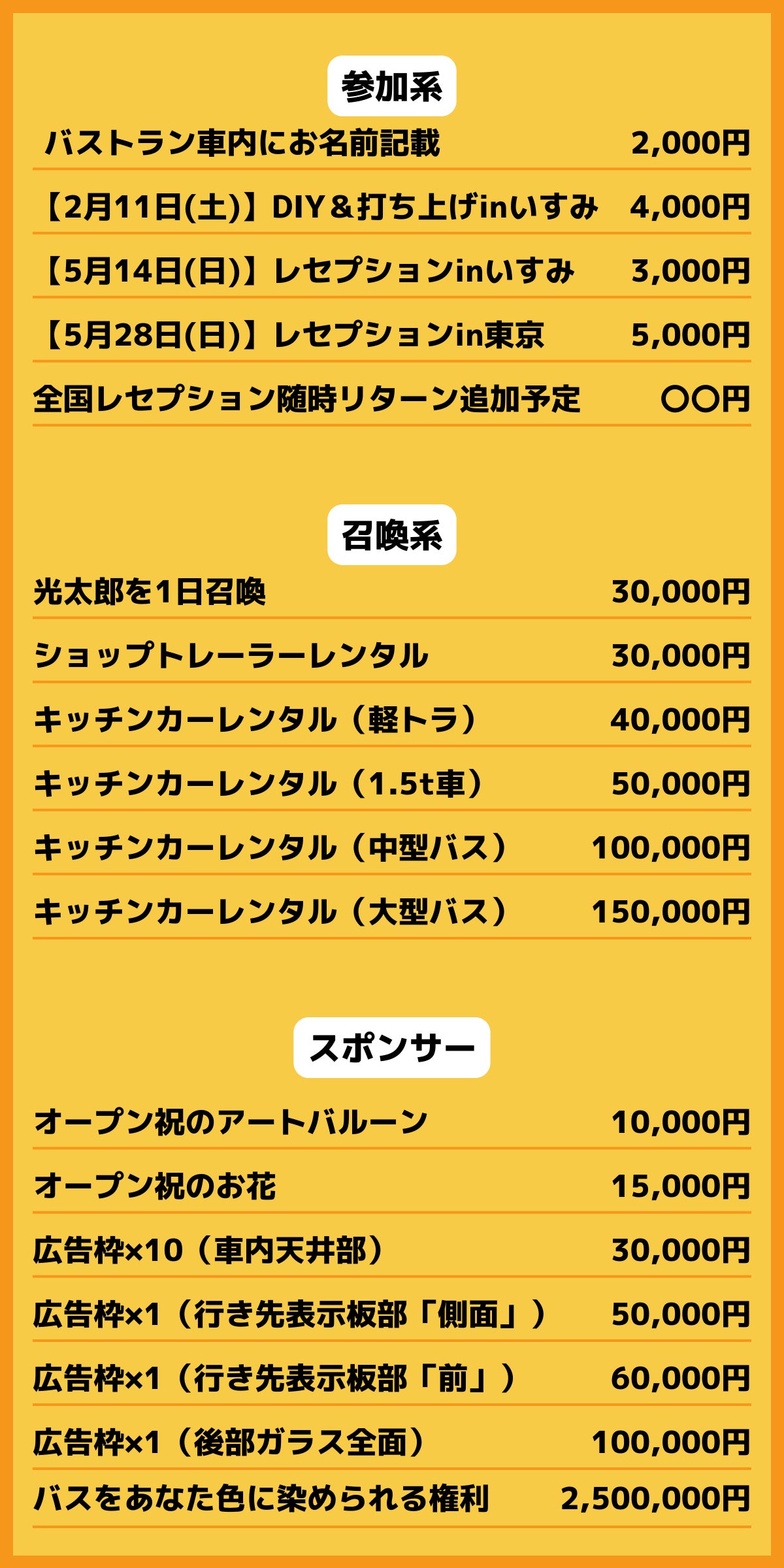 ■キッチンカーレンタルは一都三県(東京、千葉、埼玉、神奈川)までで交通費込みでこの金額となります。それ以上の遠方となる場合は支援前に一度光太郎までご相談ください。またレンタルのリターンに関しては光太郎が直接現地まで納車&回収を行います。