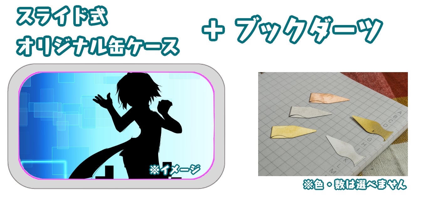 ぷらちな描き下ろしイラストの缶ケースと、読書に便利なアイテム「ブックダーツ」をセットにしてお届けするよ♪