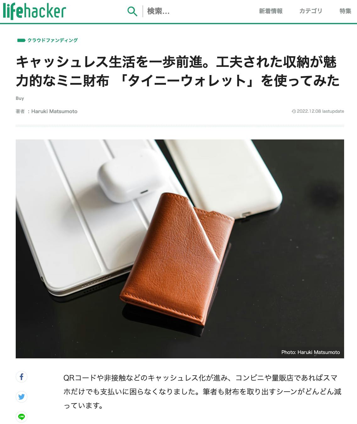 この度。ビジネスや暮らしの情報を発信するlifehacher (ライフハッカー) さんに、本企画アイテムのタイニーウォレットを記事に取り上げていただきました!