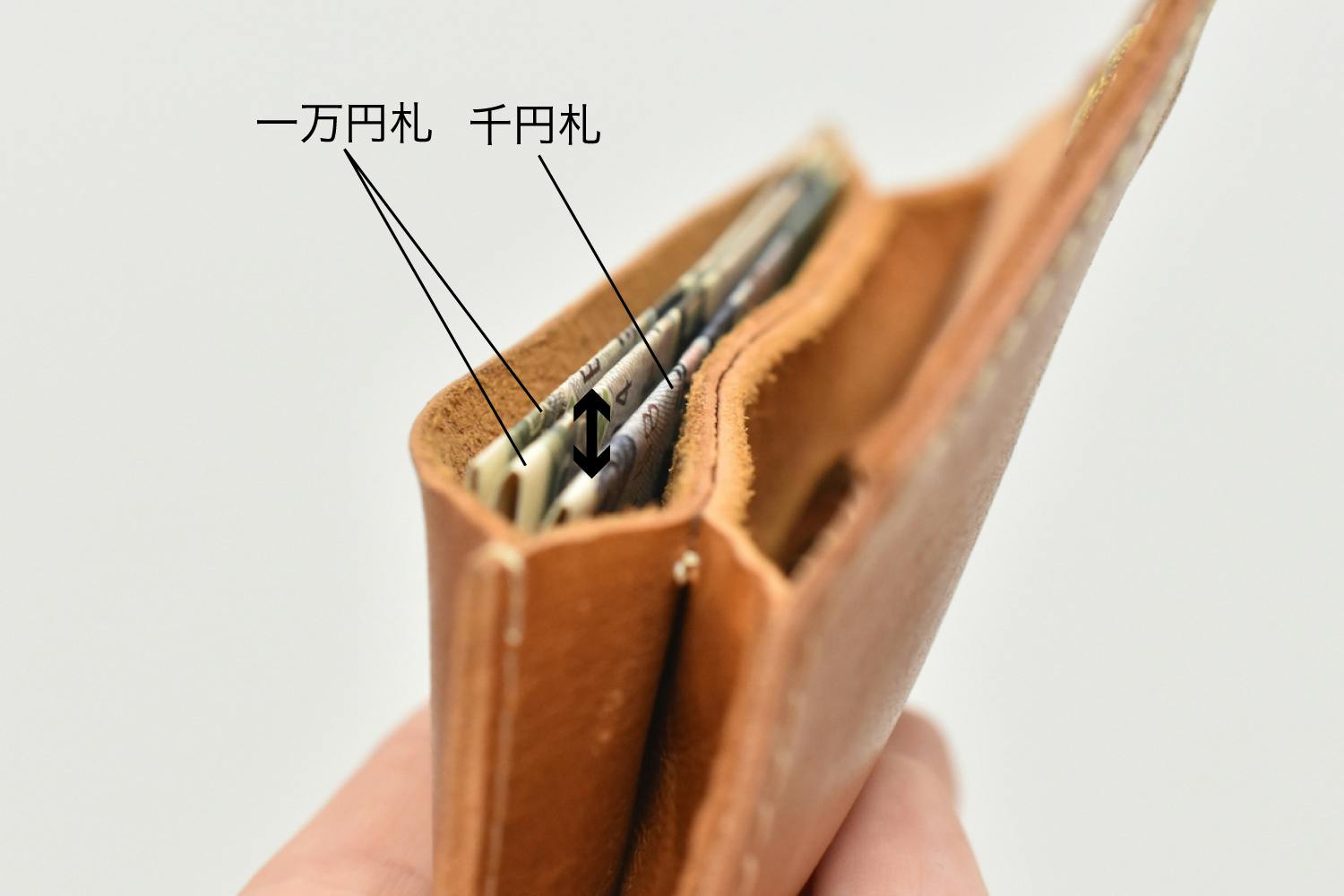 現金を美しく整列するために、マチ幅にこだわりました。お札入れにはマチが有り、小銭入れにはマチが無い設計にしています。