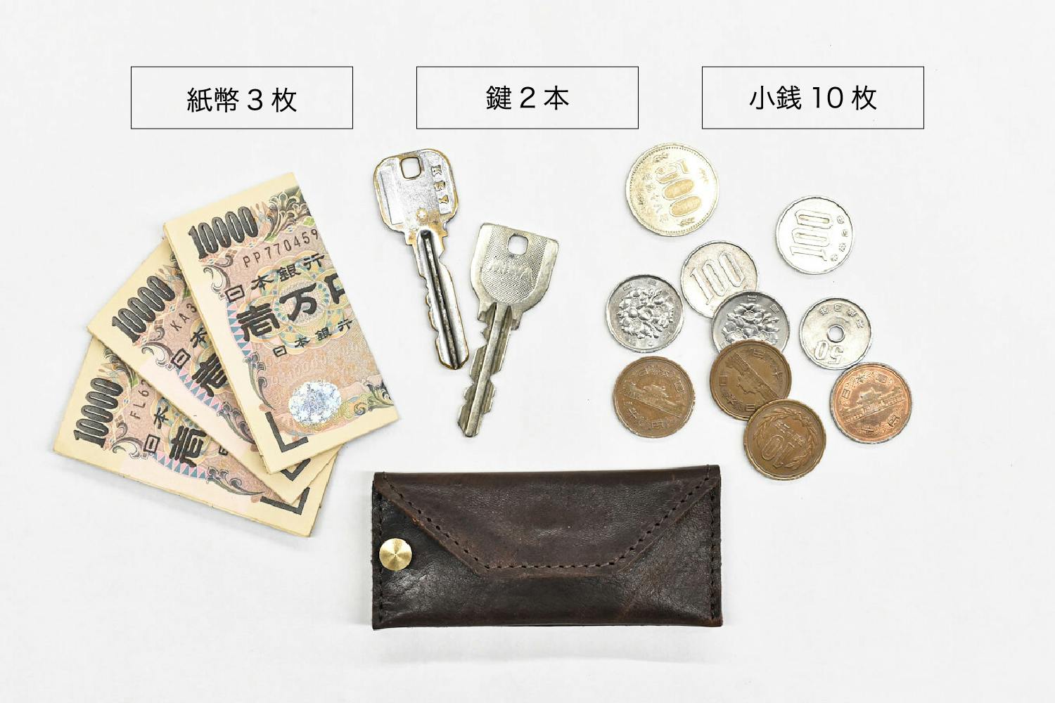 手のひらサイズなのに紙幣3枚、小銭10枚、鍵2本を収納できます。上記画像のように3万990円を所持できるので、ちょっとした支払いに十分対応可能です。