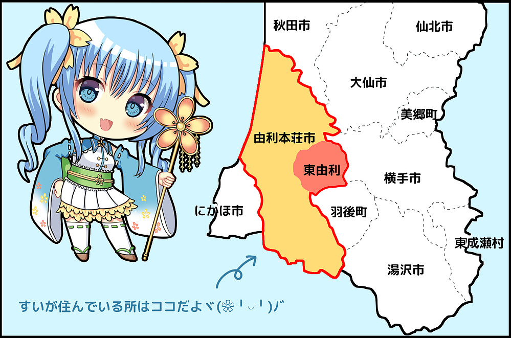 東由利はその中の一部で、黄桜すいというキャラクターはその旧東由利町の特徴からデザイン化されてます。