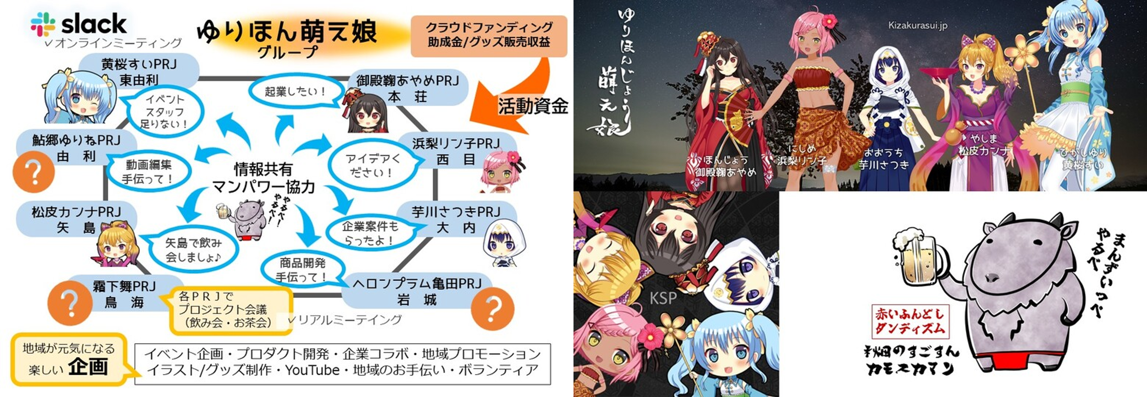 東由利以外の地域にもご当地キャラと共に地域おこしをしていく仲間が増えることでお互いに協力しながら活動がしやすくなりますし、もっと面白いことができる可能性が広がります!現在、メンバーを増やしながら色んなプロジェクトが進行中です。