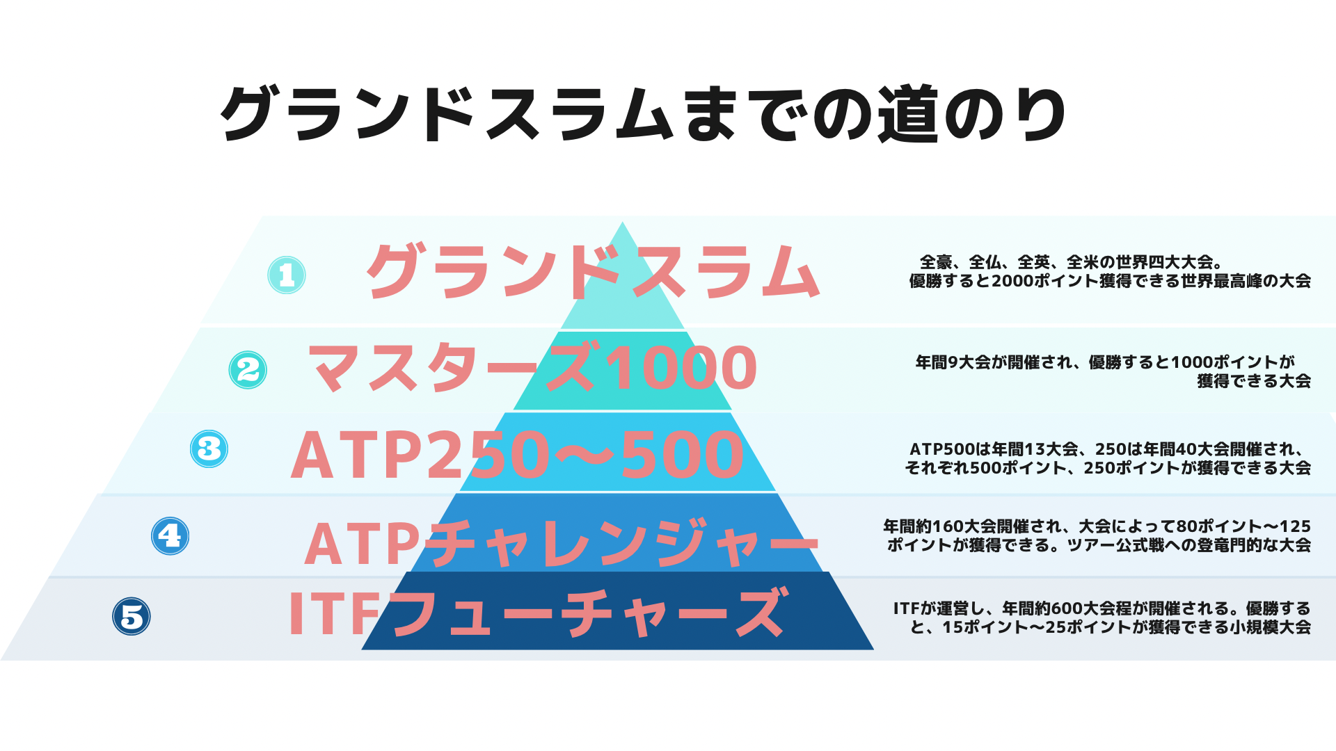 グランドスラムというのは世界のテニストーナメントの最高峰であり、その下にはATPトーナメント(250・500・1000)・ATPチャレンジャー・更には下部ツアーであるITFトーナメントがあります。