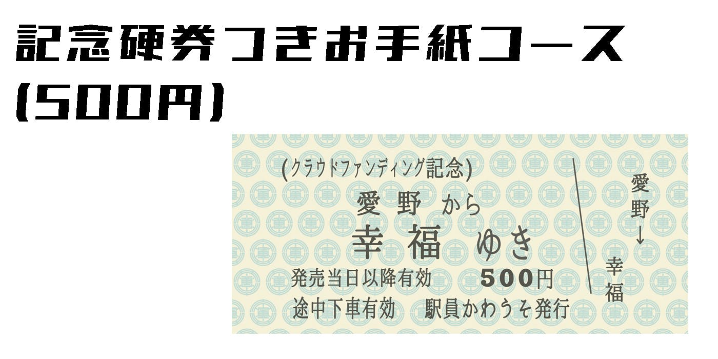 最初にご紹介するのは、記念品がついたお手紙のコースです。記念品は昔の切符である、「硬券」を模しています。記念硬券の裏面にはご支援者様のお名前を入れさせていただきます。なお、硬券に記載されている行先と出発駅は変更可能です。ご支援者様のお名前をお伺いする際に、ご要望を併せてメールでお伺いします。(切符は手作りを予定しています。)