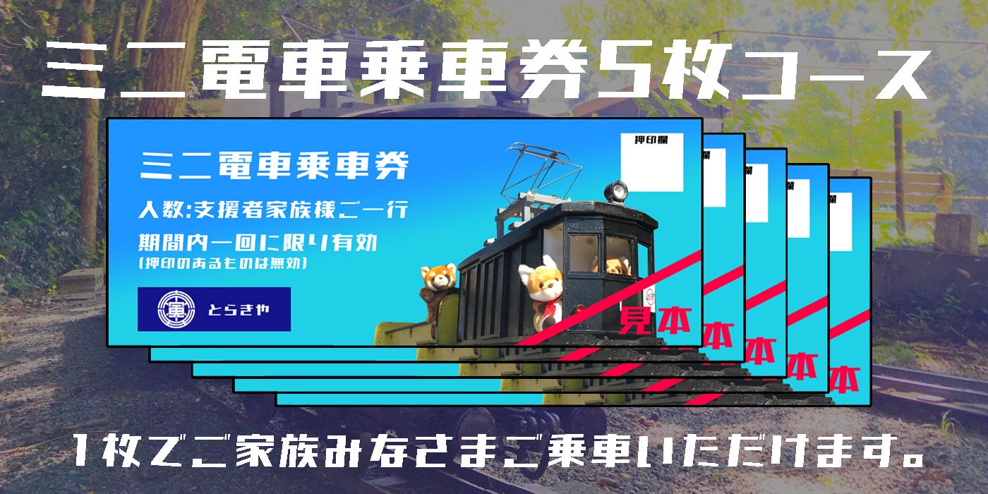 ミニ電車乗車券5枚コースです。とらきやのイベントにてお使いいただけるミニ電車の乗車券が5枚セットになっています。1枚でご支援者様の家族みなさまがご乗車いただける、かなりお得なチケットです。なお、ご登録いただいたメールアドレスに、運転会の情報をお送りします。注意事項が少し複雑なので、よく読んでお申し込みください。(チケットは手作りを予定しています。)