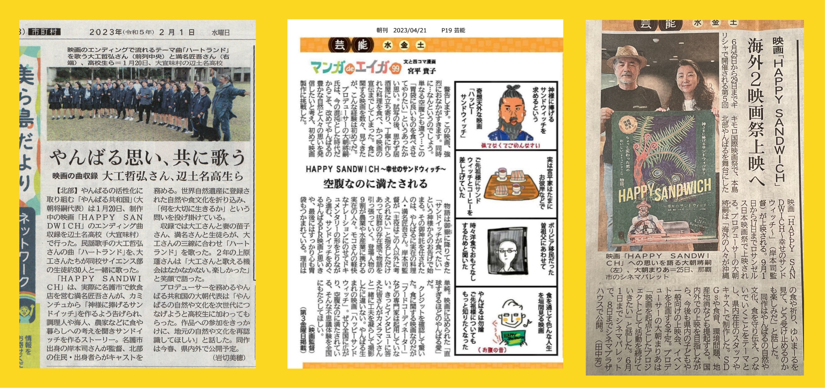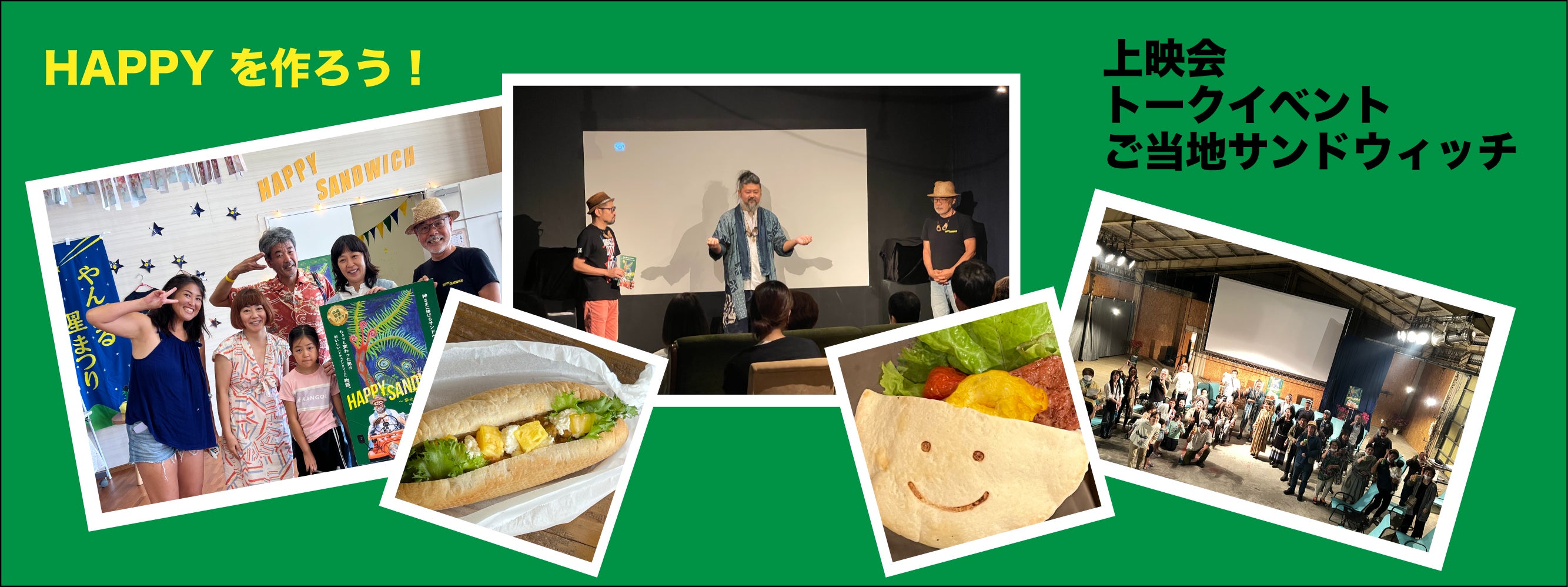 その後『守り・伝え・つなぐ』活動に発展し、その過程で映画が生まれました。やんばるの原石を集め光を当て、世界へ発信したい!を実現すべく映画。アフターコロナの現在、私たちは自身が何を大切に生き、地域や社会がどのような道を歩むべきかを考える必要があると感じ、映画『HAPPY SANDWICH』を作りました。