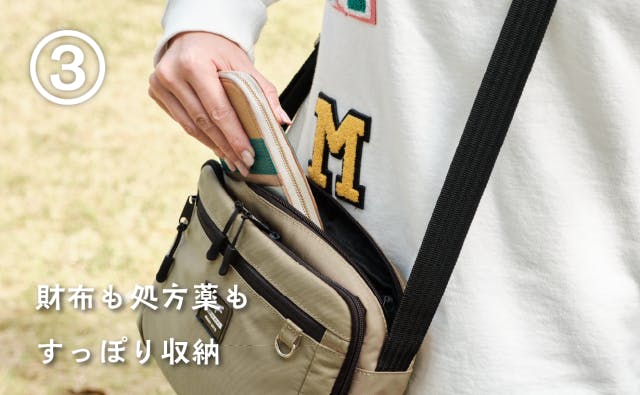 中央スペースは、約6cmあるマチのゆとりで、長財布や処方薬を入れやすい設計に。3箇所ある大きめのポケットには、ハンカチやティッシュなど身だしなみグッズを。