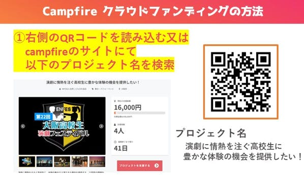 共に第22回大阪高校生演劇フェスティバルを成功させよう!高校生の文化活動を応援しよう!と思ってくださる皆様が、やり方がわからなくてと断念することなく、安心して、”気軽に”、”簡単に”、ご支援いただけましたら何よりの幸いです。