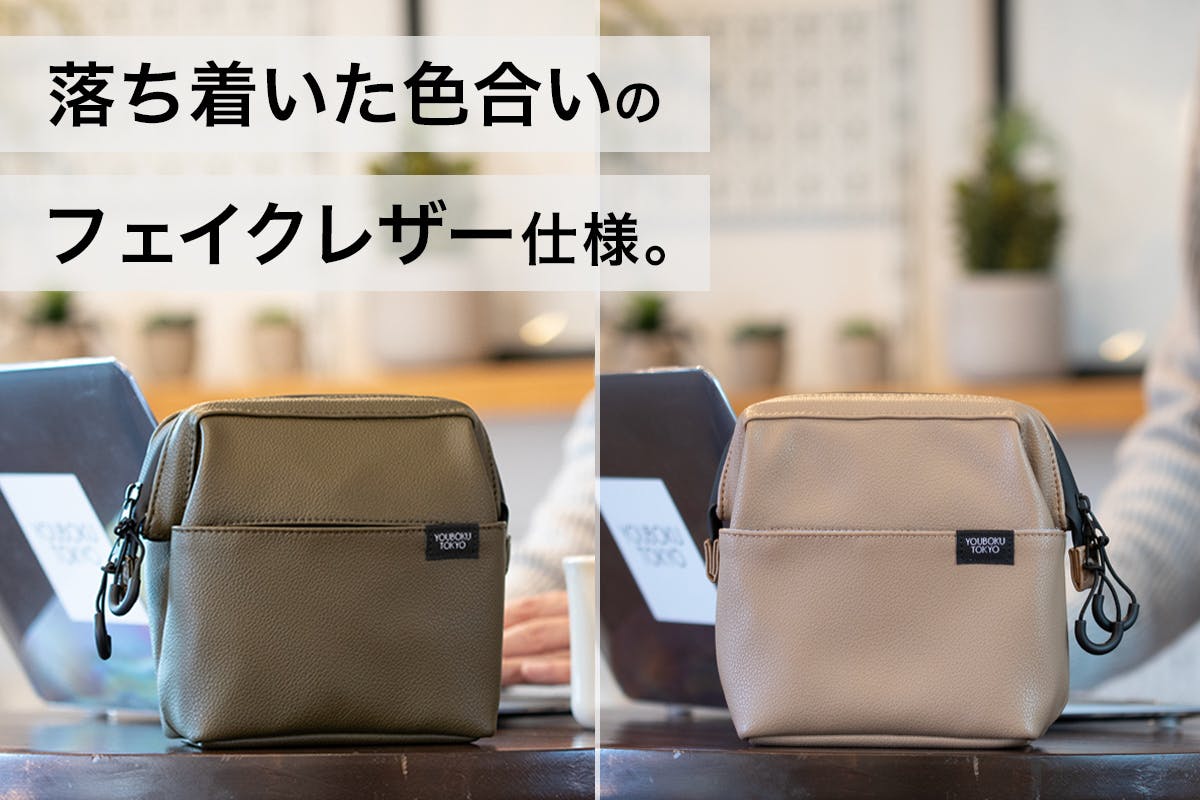そして今回、ユーザー様からの「大人が使ってもお洒落で、高級感のあるカラーのデイズポーチがほしい」というリクエストにお応えして、落ち着いた雰囲気で使うシーンを選ばないベージュと、クールモダンな印象を与えるカーキの2色を、新たに「デイズポーチ(カフェカラー)」としてリリース。フェイクレザー(合成皮革)張りの、高級感のあるデイズポーチが誕生しました。