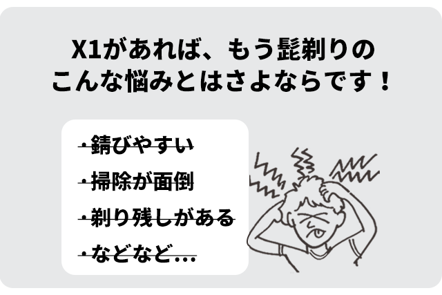 X1は切れ味が優れているだけでなく、顔の輪郭にしっかりフィットしますので、快適で痛みがありません。剃り残しも少なく、すっきり仕上がります。